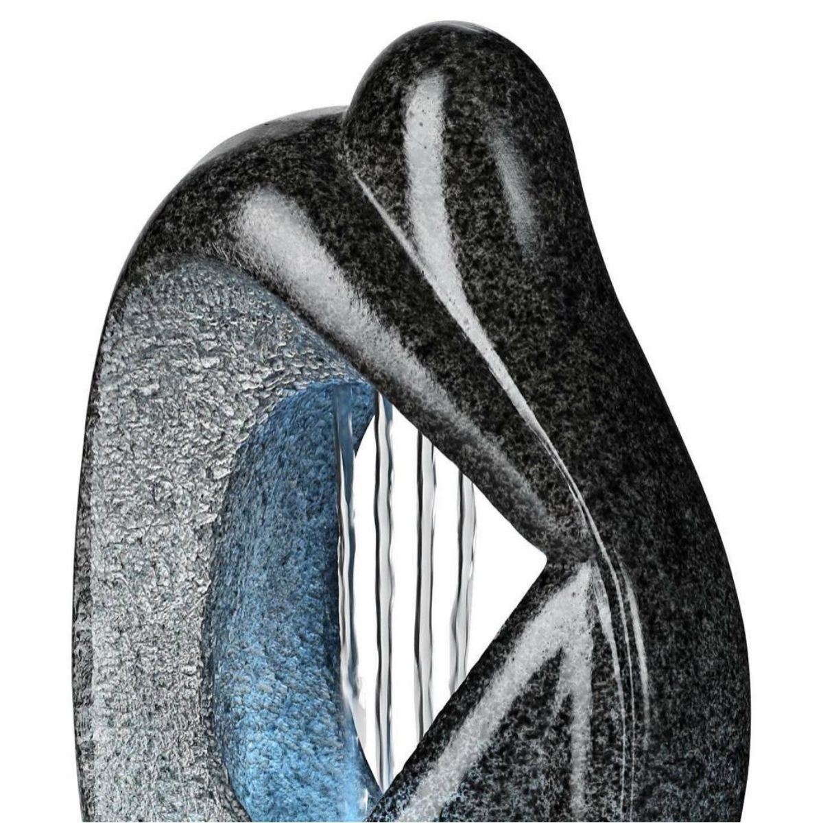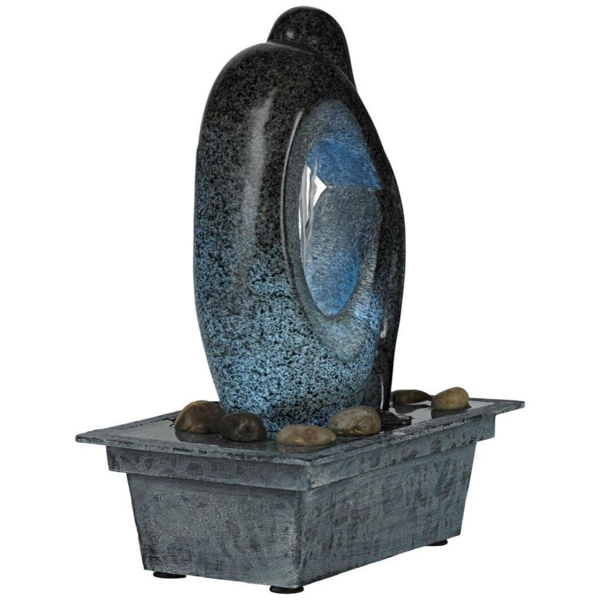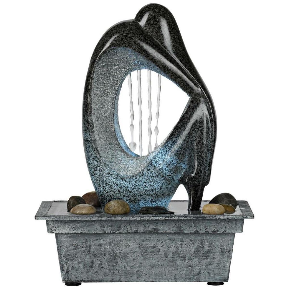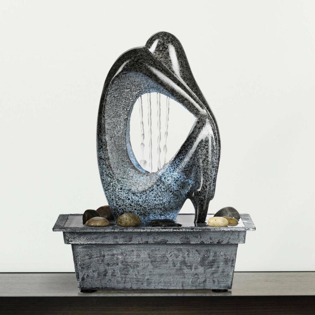 Modern Silhouette tabletop fountain with LED light cluster. Resin with faux black marble stone finish. Comes with water pump and 6' long cord. * blue-tone shown in images is  a reflection from the LED light. 10" high x 7" wide x 5" deep. Weighs 8.2 lbs. Â