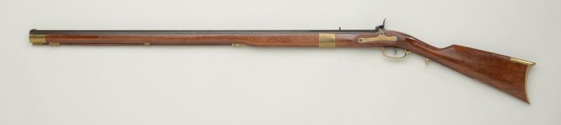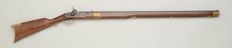 Modern Spanish-made copy of a full stock  plains type percussion rifle, .45 cal., 34”  octagon barrel, blue and case hardened  finish, wood stock, #NVSN. This gun is in  overall excellent condition showing littleuse; great for display or re-enactor’s  Rendezvous.  Est.:  $75-$150.