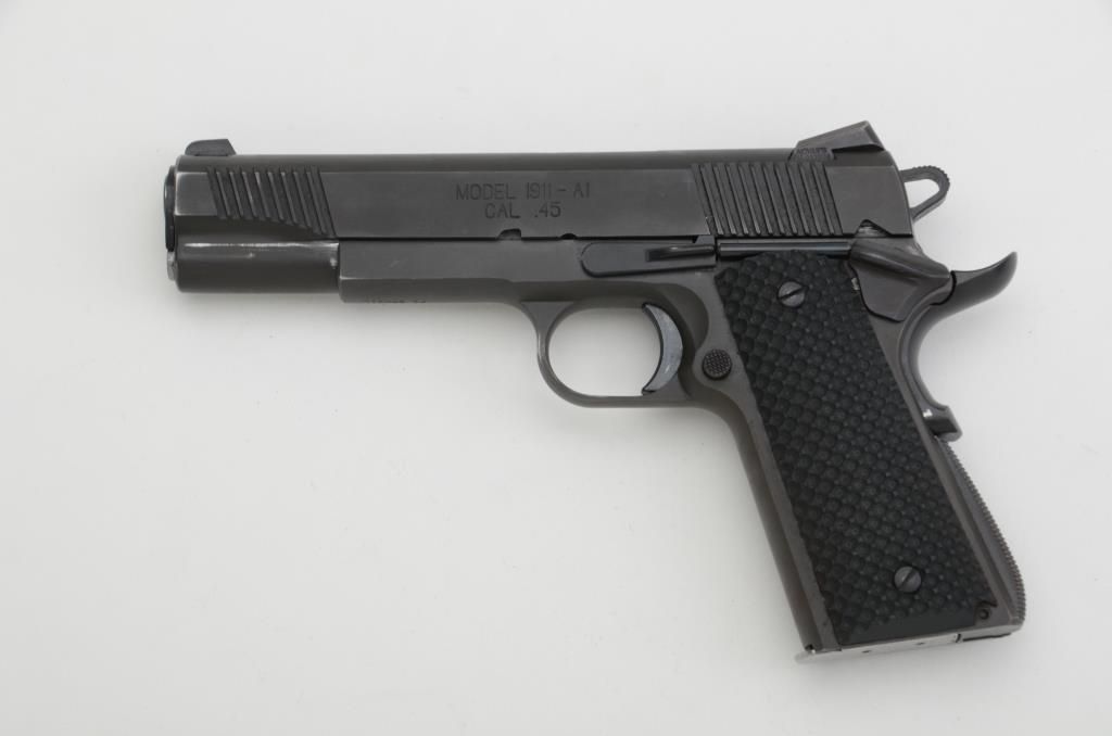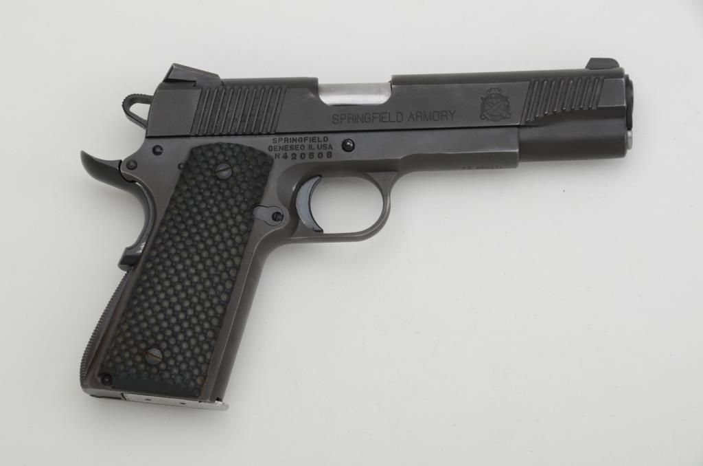 Modern Springfield Armory Model 1911-A1 semi-auto pistol, .45 cal., 5” barrel, mat black finish, Samonich custom black grips, one extra magazine, #N420506 with blue plastic carry case, cleaning brush and soft“Team Springfield” boot. This gun is in overall fine condition with a fine bore, action, markings and grips. Est.: $500-$1,000.