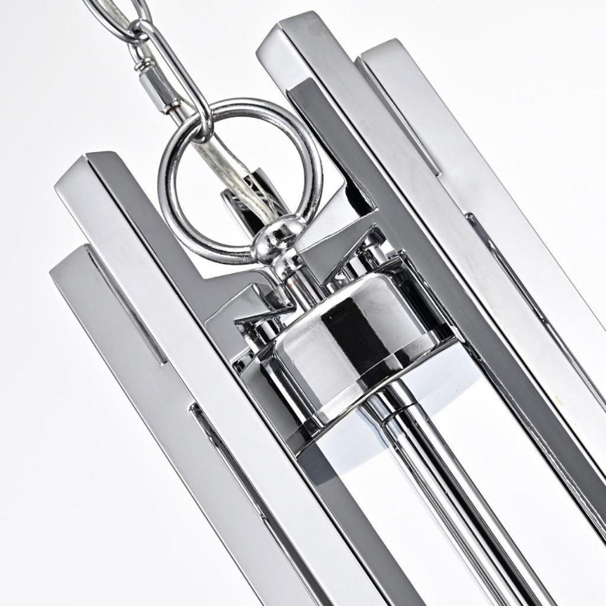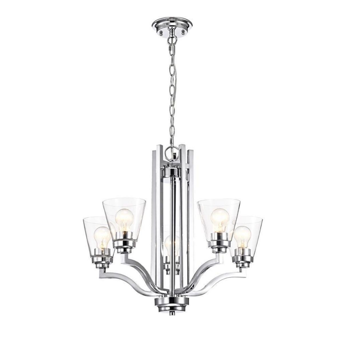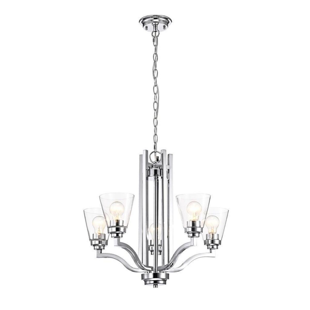 Modern style chrome finish steel 5 light chandelier. 20 1/2" H X 23 3/4" W. Clear glass 5" cones.