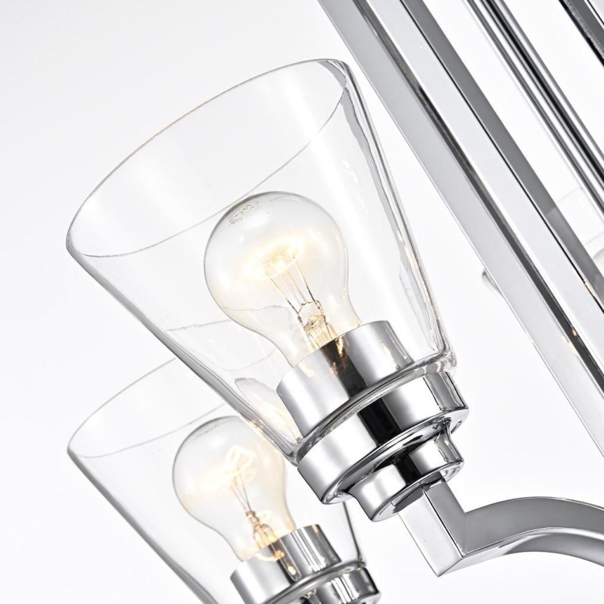 Modern style chrome finish steel 5 light chandelier. 20 1/2" H X 23 3/4" W. Clear glass 5" cones.
