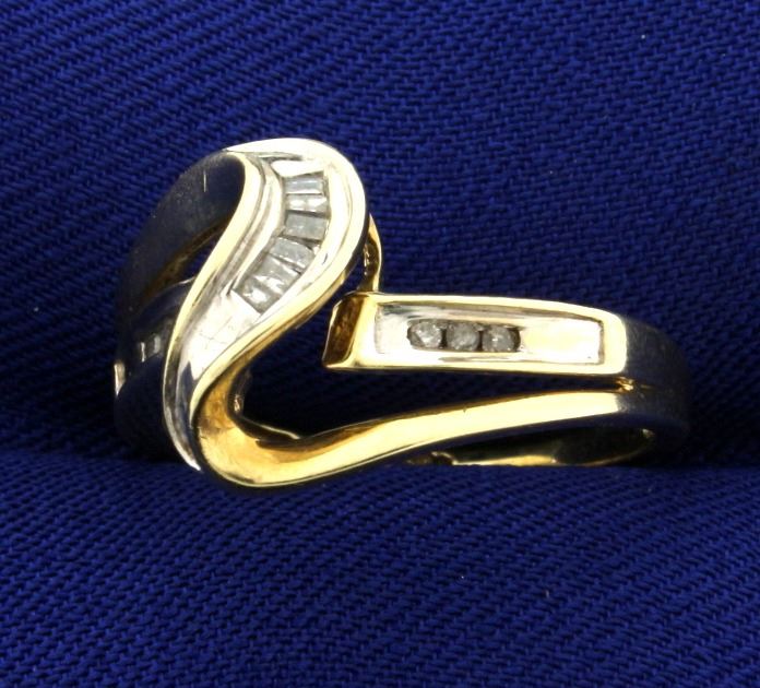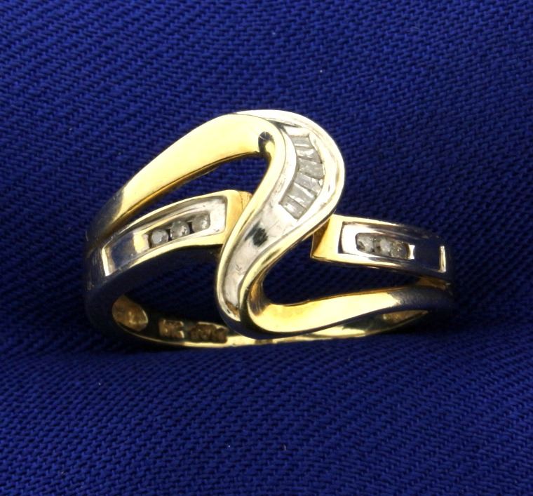 In 10k yellow and white gold, containing six .01ct round diamonds and six baguette diamonds. All H color/I clarity. Size 7 1/2. 2.9g.
