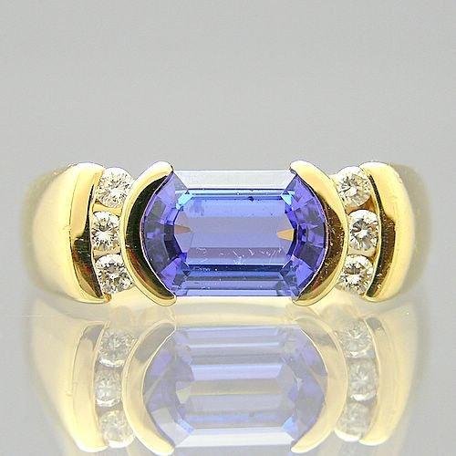 Modern 14 kt. yellow gold tanzanite & diamond ring with the center in a partial bezel design flanked by diamond set curved channels. This simple contemporary design is set with a capsule shaped step cut genuine tanzanite. The stone gauges 9.0 mm. (Length) x 6.0 mm. (Width) and weighs approx. 1.50 carats. The colour is medium slightly greyish violetish royal blue with moderately strong pinkish purple pleochroism. This is flanked by six (6) brilliant cut diamonds weighing approx. 0.18 ct. total. This ring size is seven (7) but can be easily sized.