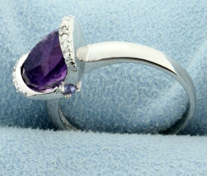 The tension set 2.3ct amethyst ring with tanzanite and diamonds is set in platinum over sterling silver. Size 7 1/2 2.8g