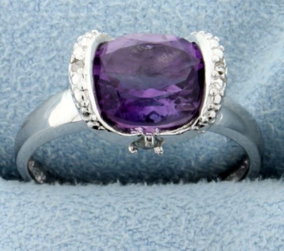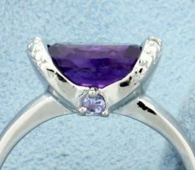 The tension set 2.3ct amethyst ring with tanzanite and diamonds is set in platinum over sterling silver. Size 7 1/2 2.8g