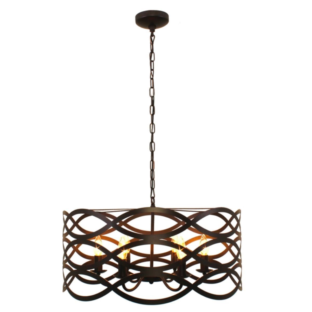 Transitional-style 6-light iron & metal ceiling pendant light with oil rubbed bronze finish. 24" W X 24" L.