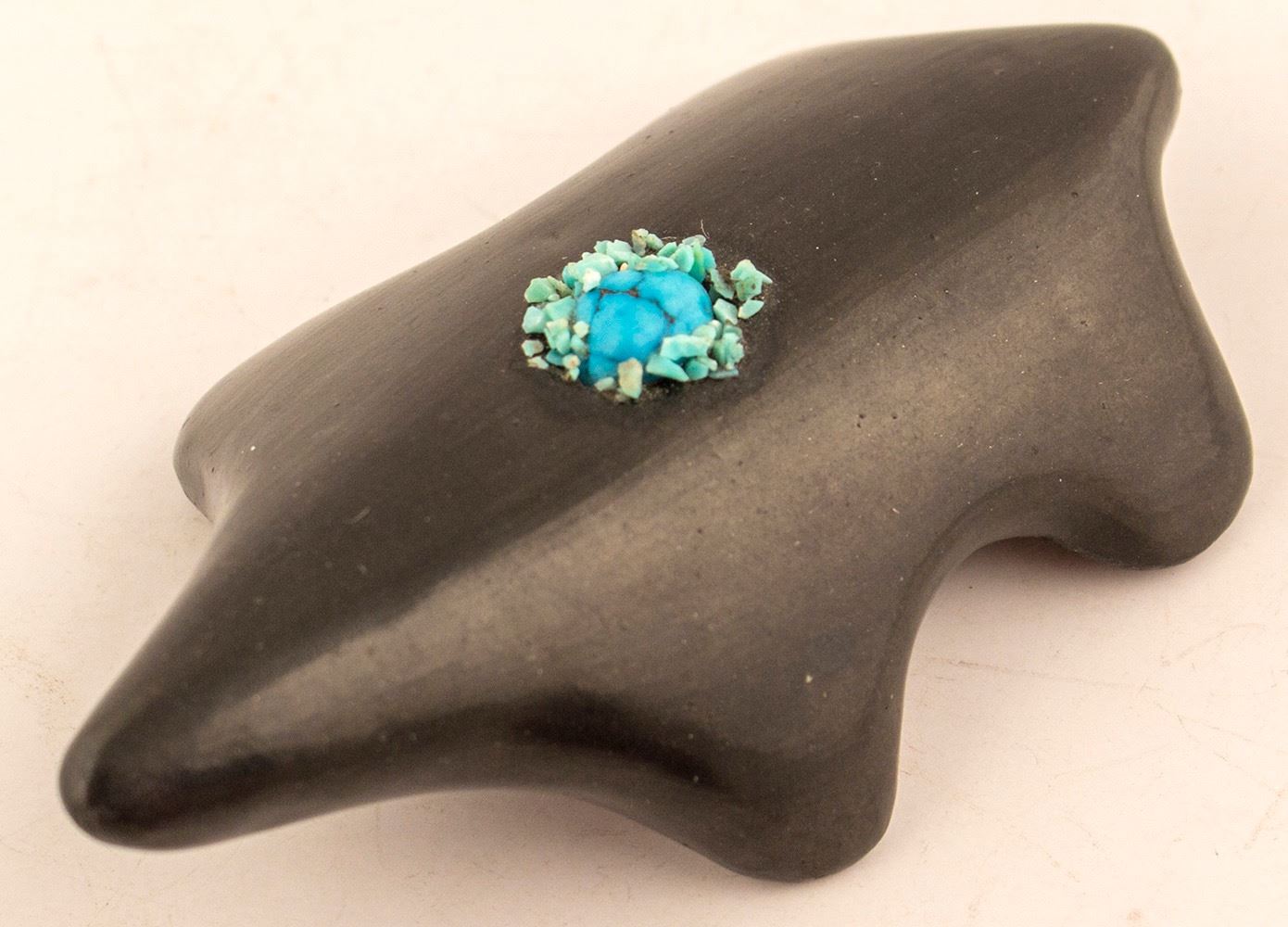 Modern turtle w/ inlay of turquoise attributed to Gutierrez, bear claw mark on base. 5." x 2.75" x 1.75". Elegant design. Date: c.2006 Location: Santa Clara Pueblo, New Mexico HWAC # 52704