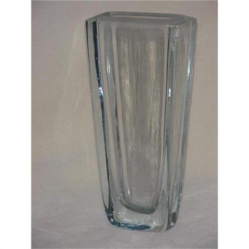 A modern glass vase, 11 1/2" tall, 5 1/2" wide at the top tapers to 3 1/2" at the base. Thick walled glass would make a striking addition to a modern setting or any setting for that matter. Condition is very good, no chips or cracks. There is a slight calcium build up at opening of vase. Unsigned.