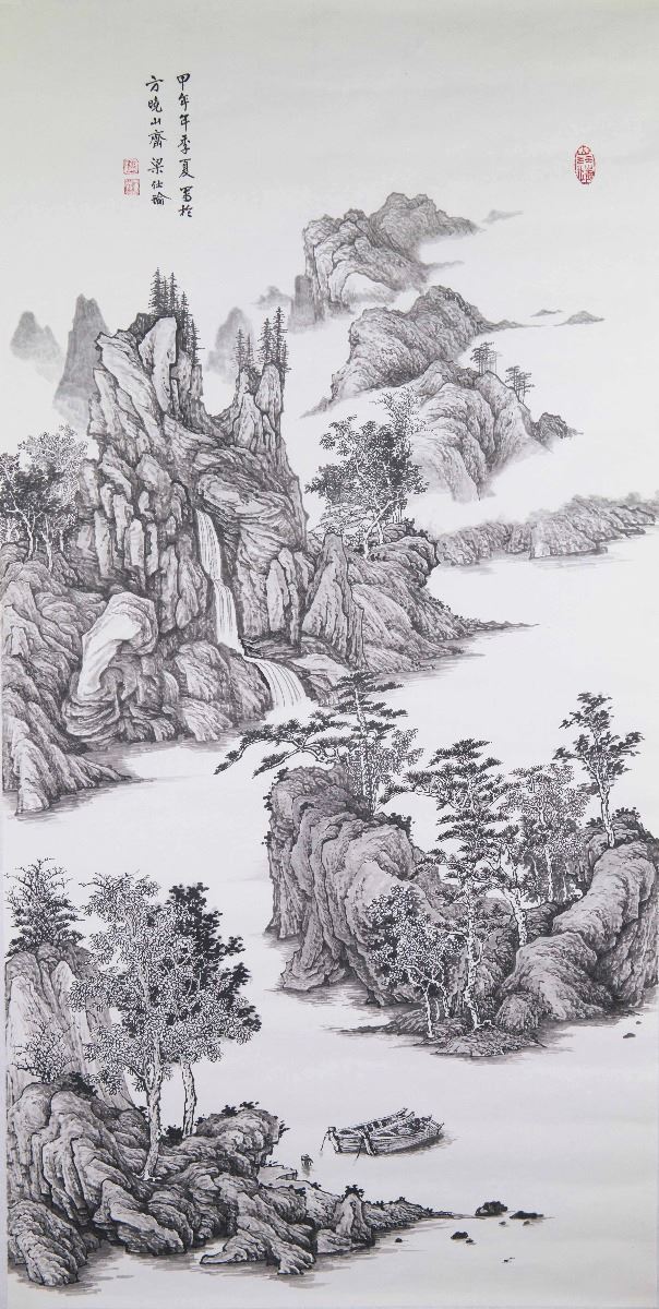 Landscape; Chinese watercolour and ink on paper; signed Liang Shiyu and inscribed with three artist seals; 138 cm x 69 cm