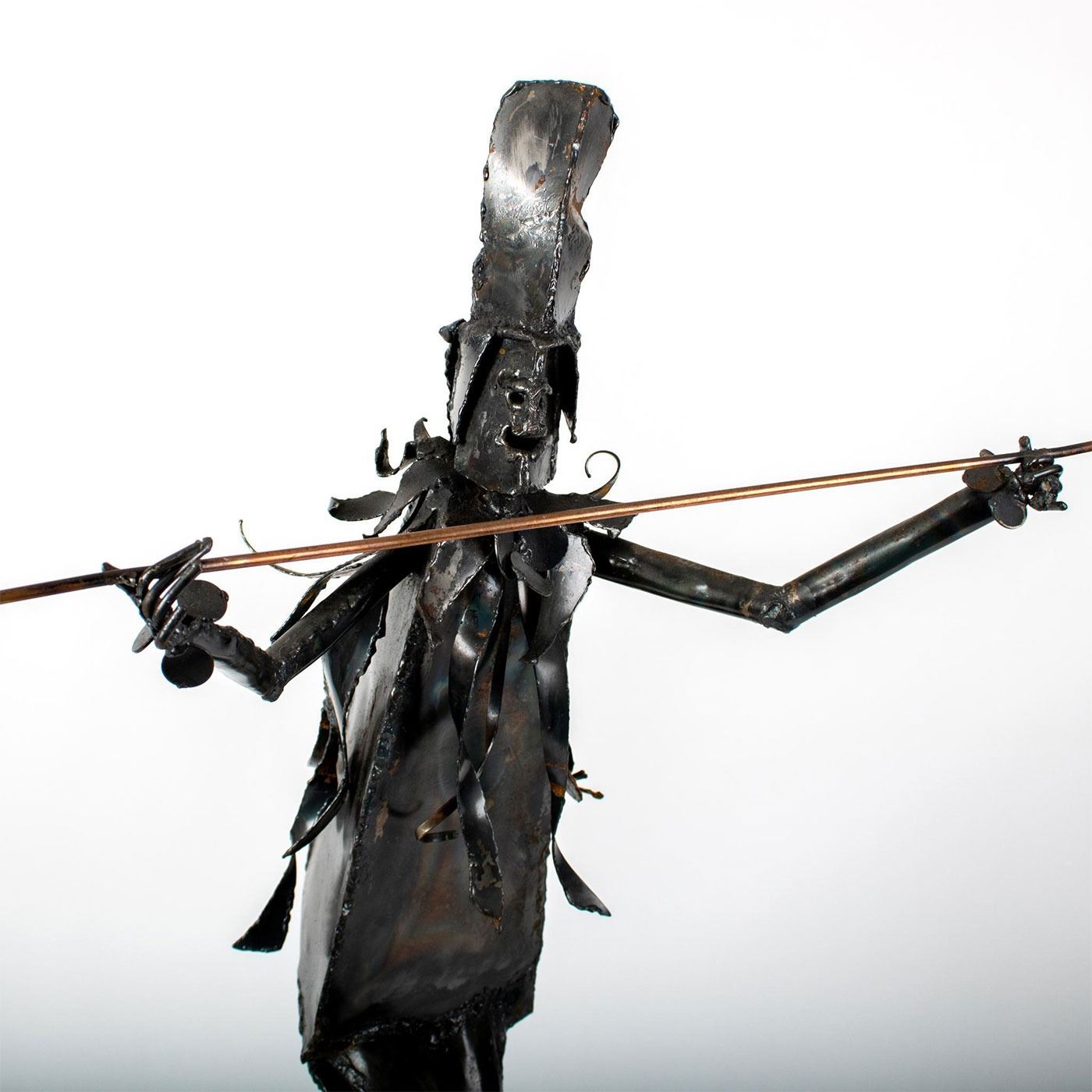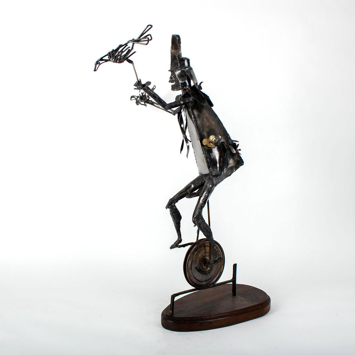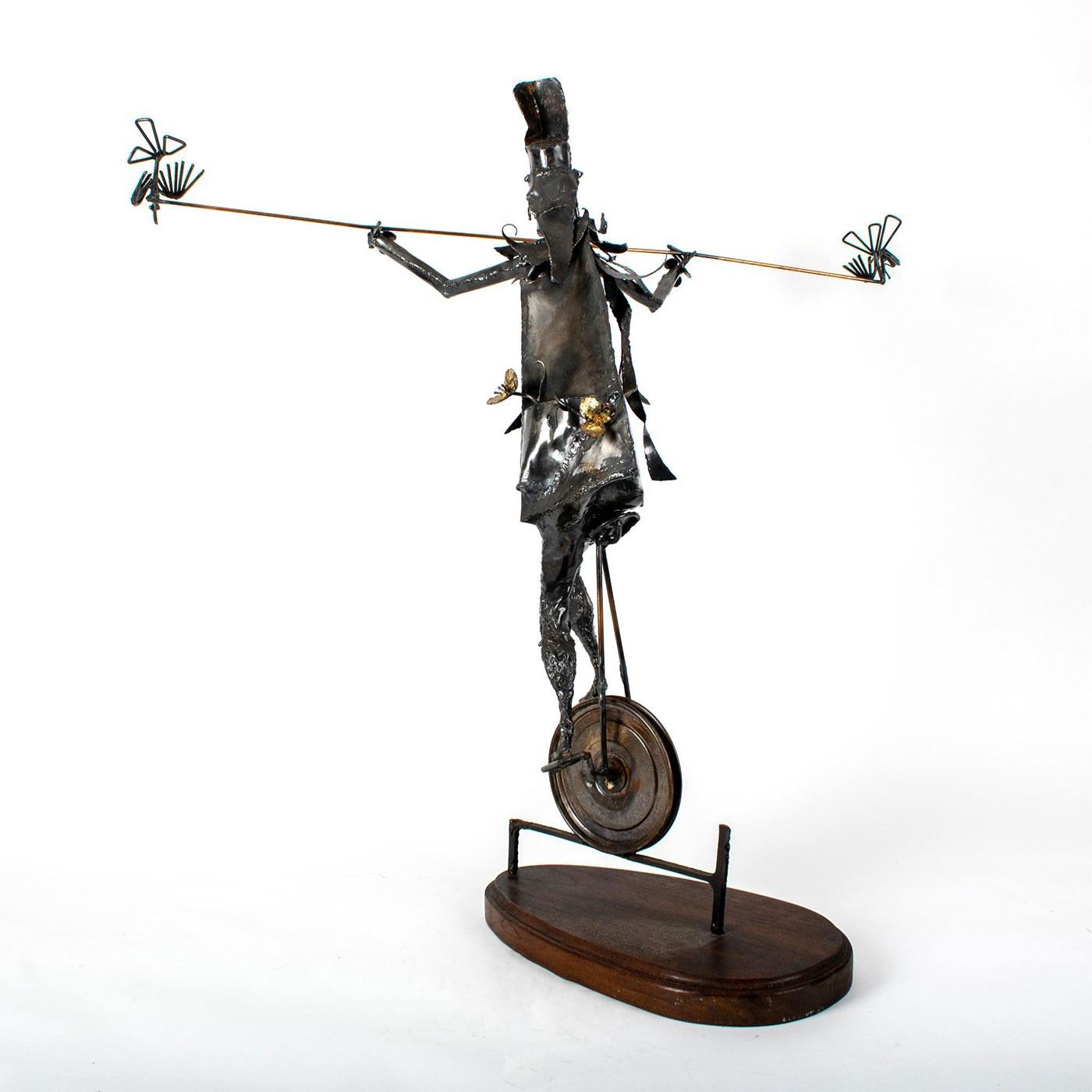 Mid-Century sculpture, features an acrobat clown on a unicycle balancing on a wire while holding a pole with birds on the ends. Signed on lower coat border and mounted to a wooden base.