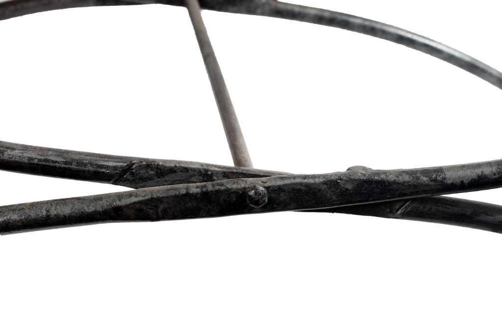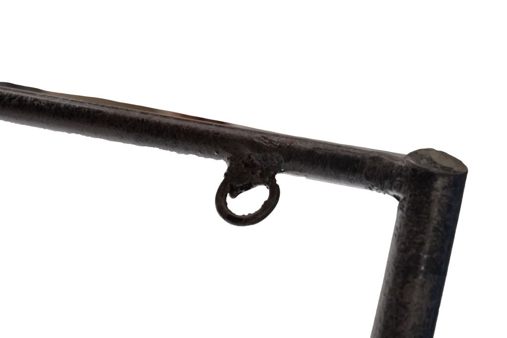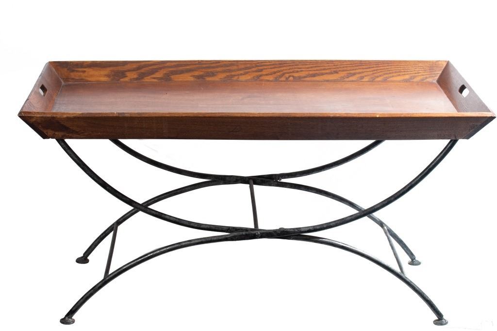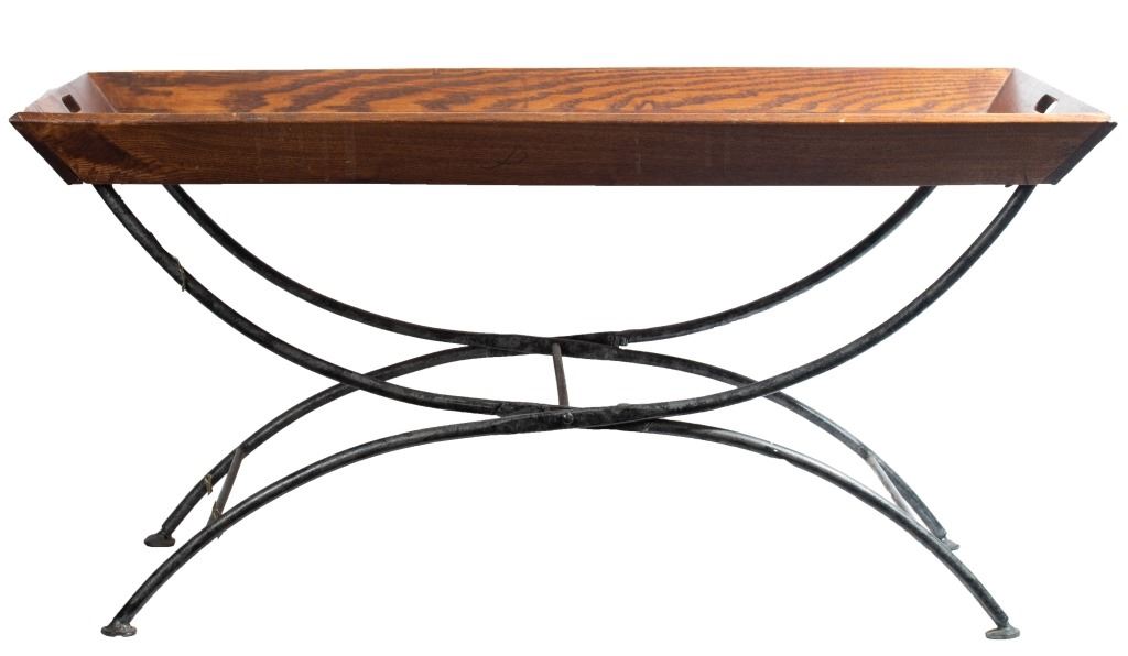 Item/Description: Mid Century coffee table. Brutalist, foldable painted steel base features a curved 'X' shape with support bars. Removable wood tray has two hand hole handles. Unknown maker, no noticeable makers mark.