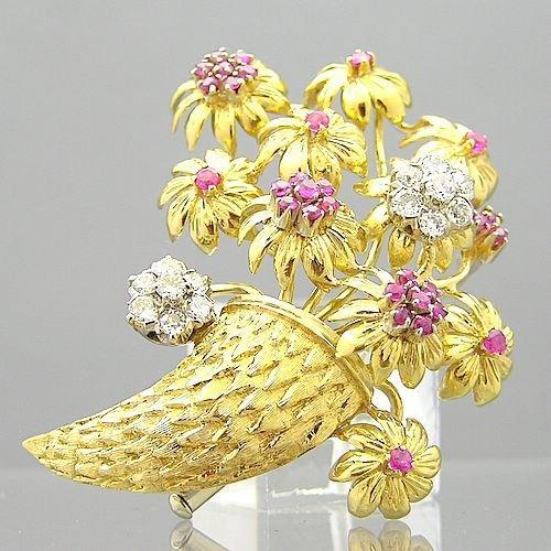 A modern ruby and diamond brooch. This is 18 kt. yellow gold with two (2) 10 kt. white gold cluster designs in a floral spray design, with the sprays eminating from a cornucopia. The brooch measures 1.9375 in. (length) x 1.5 in. (width). The cornucopia is finished in a linear texture and the flowerheads have bright cut linear patterns on the petals. There are two (2) cluster designs set with a total of fourteen (14) brilliant and Swiss cut diamonds weighing approx. 0.80 ct., total. The brilliants are modified modern cut and two (2) are chipped. The brooch is also set with thirty (30) brilliant and single cut rubies weighing approx. 0.91 ct., total. The colour ranges from light to medium pinkish red to medium deep slightly purplish red, one of these is chipped but is securely set.