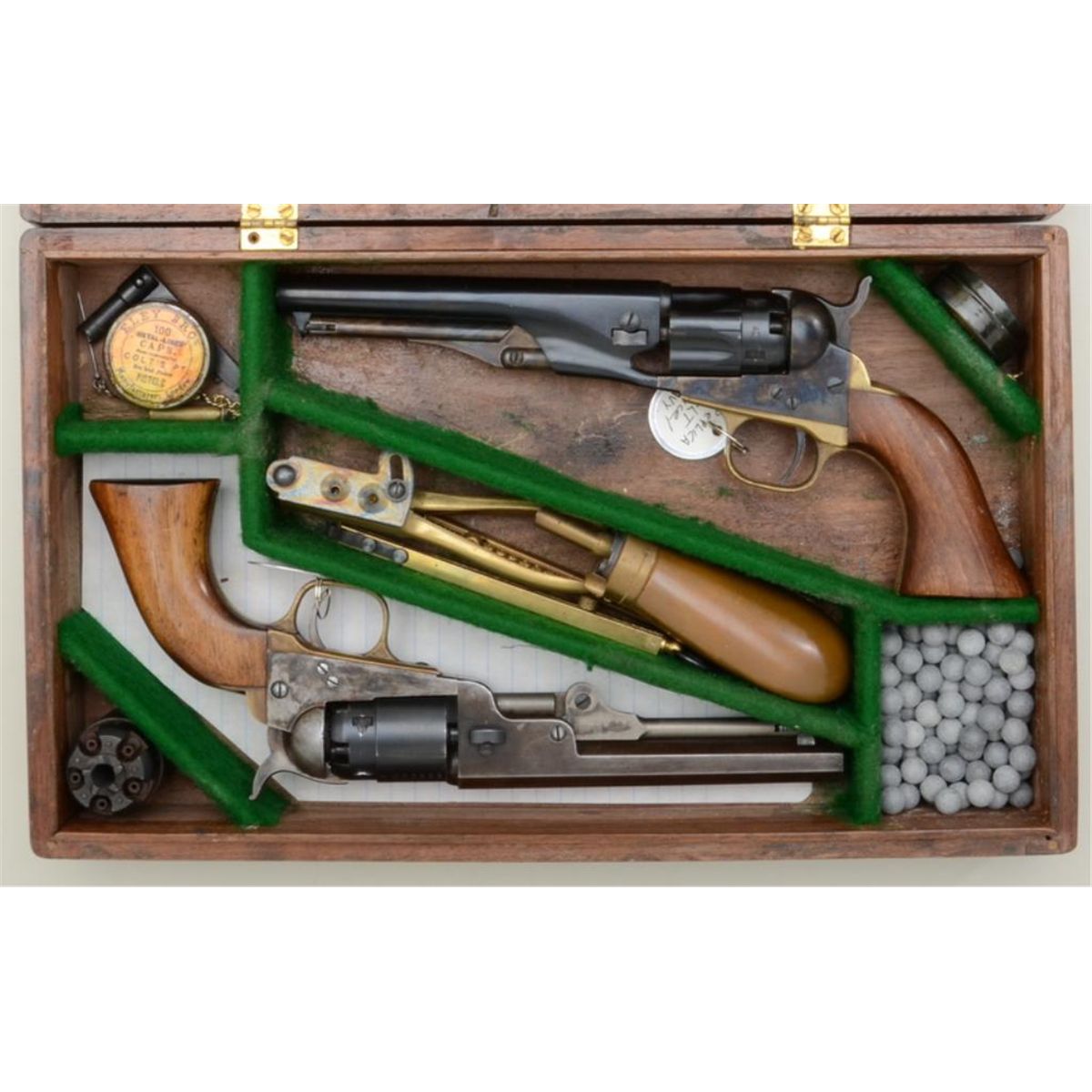 Modern cased pair of reproduction Colt percussion pocket revolvers including a repro. copy of a Colt Model 1862 Police percussion revolver, .36 cal., 5-1/2” barrel, blue and case hardened finish, wood grips,#B35094 in overall fine condition; also a repro. copy of a Colt Pocket Navy percussion revolver, .36 cal., 5-1/2” barrel, blue and case hardened finish, wood grips in overall very good condition, #000629; accessoriesinclude two repro cap tins, two modern capping tools, a brass flask, bullet mold, combination nipple wrench and an extra cylinder for the Pocket Navy; also cast lead balls; interior of casing shows some liningon the partitions; overall nice modern wood case. Est.: $300-$500.