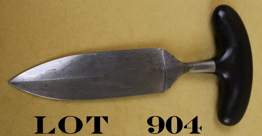 Modern constructed push dagger with wood grip and Damascus patterned blade approx. 7” overall with an approx. 4” blade in overall good condition; wood grip is of dark hard wood and also in overall good conditionshowing some minor wear. A nicely constructed representative example of this style of knife. Est.: $100-$200.