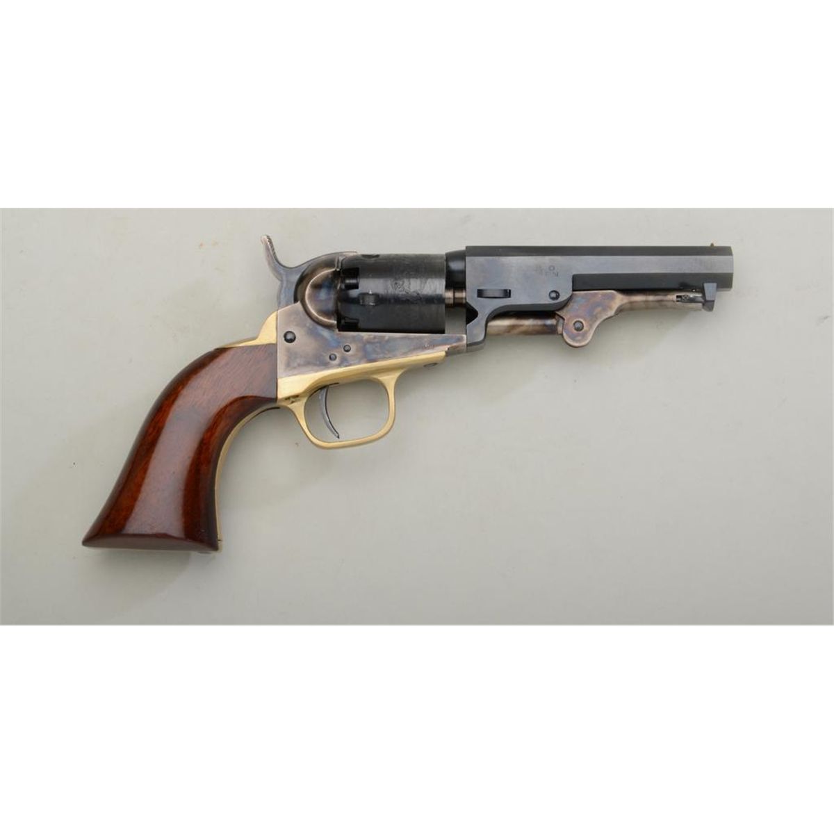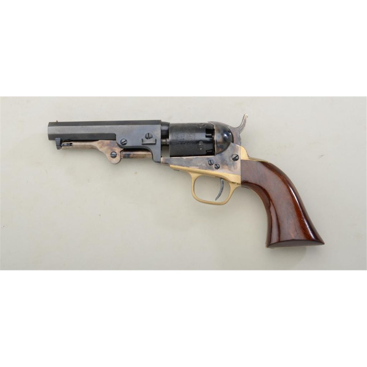 Modern copy of a Colt Model 1849 Pocket Model percussion revolver, .31 cal., 4” barrel, blue and case hardened finish, wood grips, #A22549. This gun is in like new condition showing little handling. Est.: $100-$200.