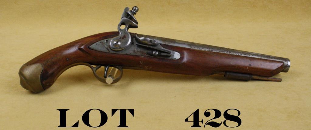 Modern copy of a Tower flintlock single shot pistol, .69 cal., 9” round barrel, “in the white”, wood stock, brass furniture, #8092. This gun shows little use but poor storage with scattered areas of erosion and surfacerust on metal surfaces; good bore and action, good wood with some scattered nicks and mars from storage. Est.: $50-$75.