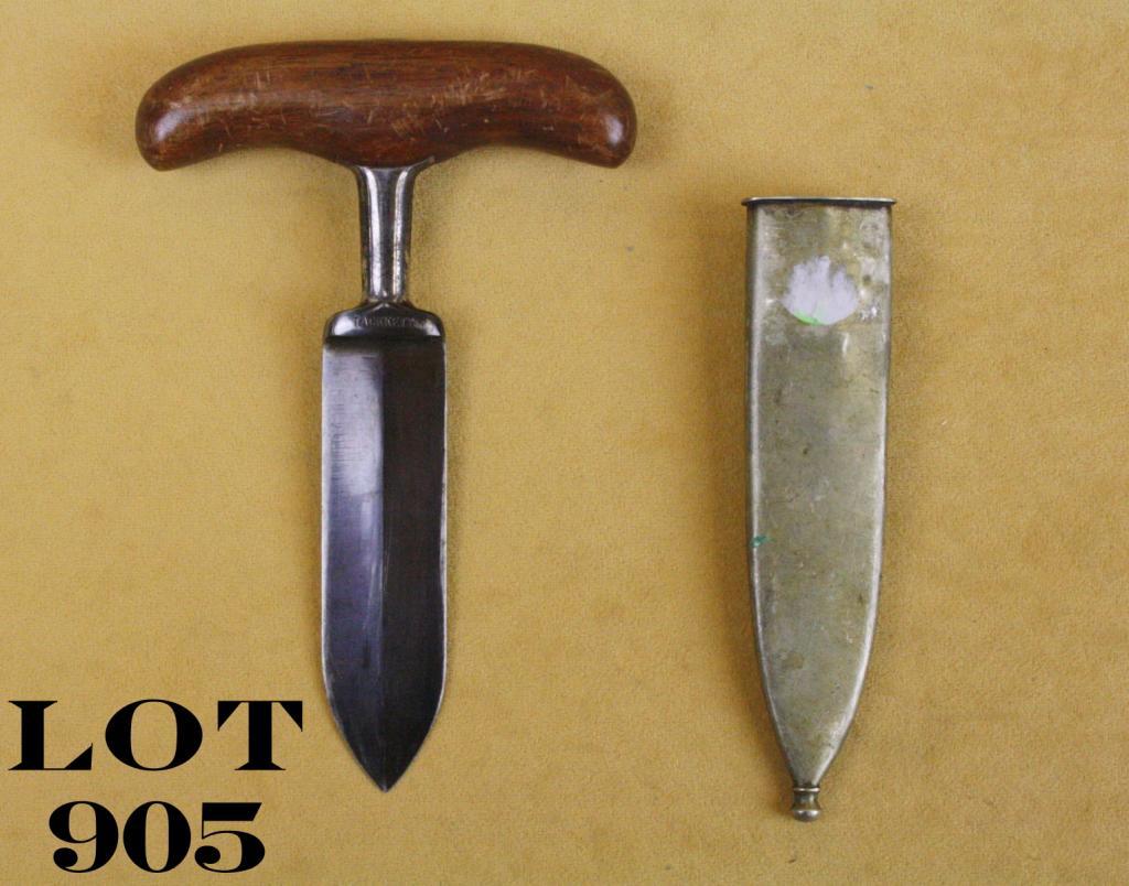 Modern copy of a push dagger with metal sheath that shows greater age. The knife is approx. 6” overall with an approx. 3-1/2” modern blade marked “Tackkett” at the hilt and showing a muted blue finish with evidence of some sharpening; the wood grip is overall good with mars and scratches from carry and storage; the metal sheath retains a metal belt loop at the throat and shows some old dents under a heavy patina to the metalsurfaces. Est.: $100-$200.