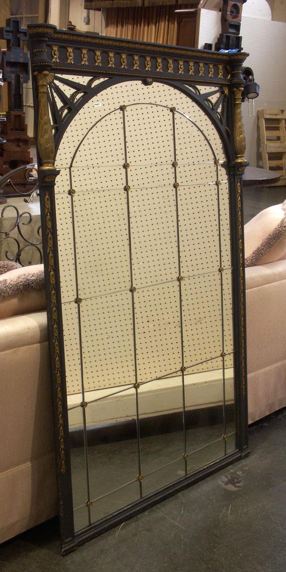 CLASSIC MANTLE OR WALL MIRROR: Modern decorator black and gold art frame mirror containing an oval-shaped cut window of 29 mirrors separated by beveled edges and held with brass fasteners. 61.5''H x 41.5''W