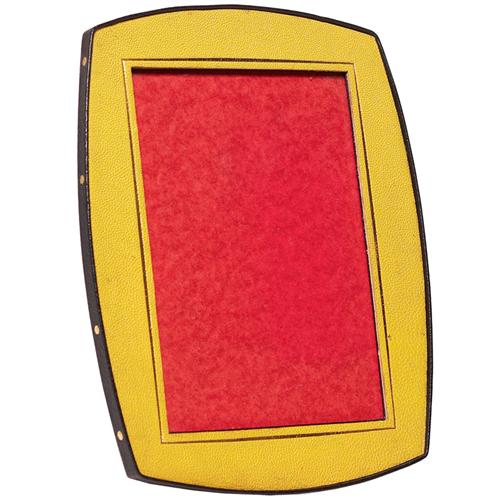 Modern frame, yellow leather with gold tooled accent all framed in black, 9"h