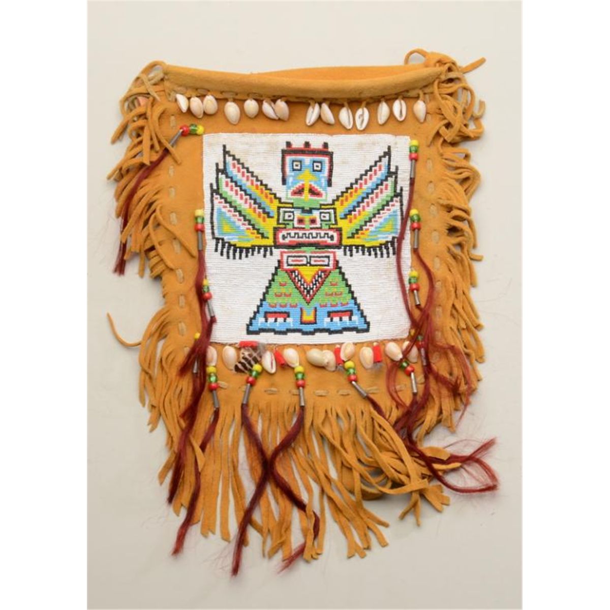 Modern-made American Indian beaded bag, approx. 19” x 16” including fringe, trimmed in cowry shells, beaded tin cones and horsehair drops; seed beaded panel is done in colorful Kachina design; bag is in overallfine condition. Est.: $150-$300.