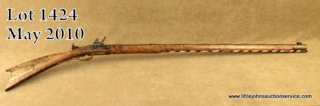 Modern made black powder flintlock target rifle, .50 cal., 42” octagon barrel marked “A. M. Osterman” (lock plate also marked “A.M. Osterman”), brass mountings including patch box on right side of butt stock, nicely grained birdseye maple full stock. This gun is in overall very good to excellent condition showing an even brown patina on the barrel and case color to lock plate and hammer; double set triggers working at time of description; crisp action, bore should clea good; hooded front sight, Lyman adjustable tang sight, brass tipped wood cleaning rod. A really nicely done modern flintlock target rifle with beautiful wood stock. Est.: $400-$800.