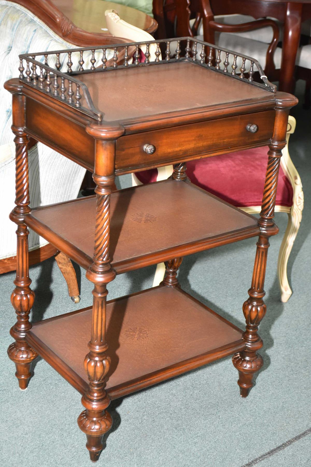 Modern mahogany three tier open shelf with single drawer and attached cast galley and leather inset shelving and top surface, Dimensions within the skirted area are18" x 12 3/4"