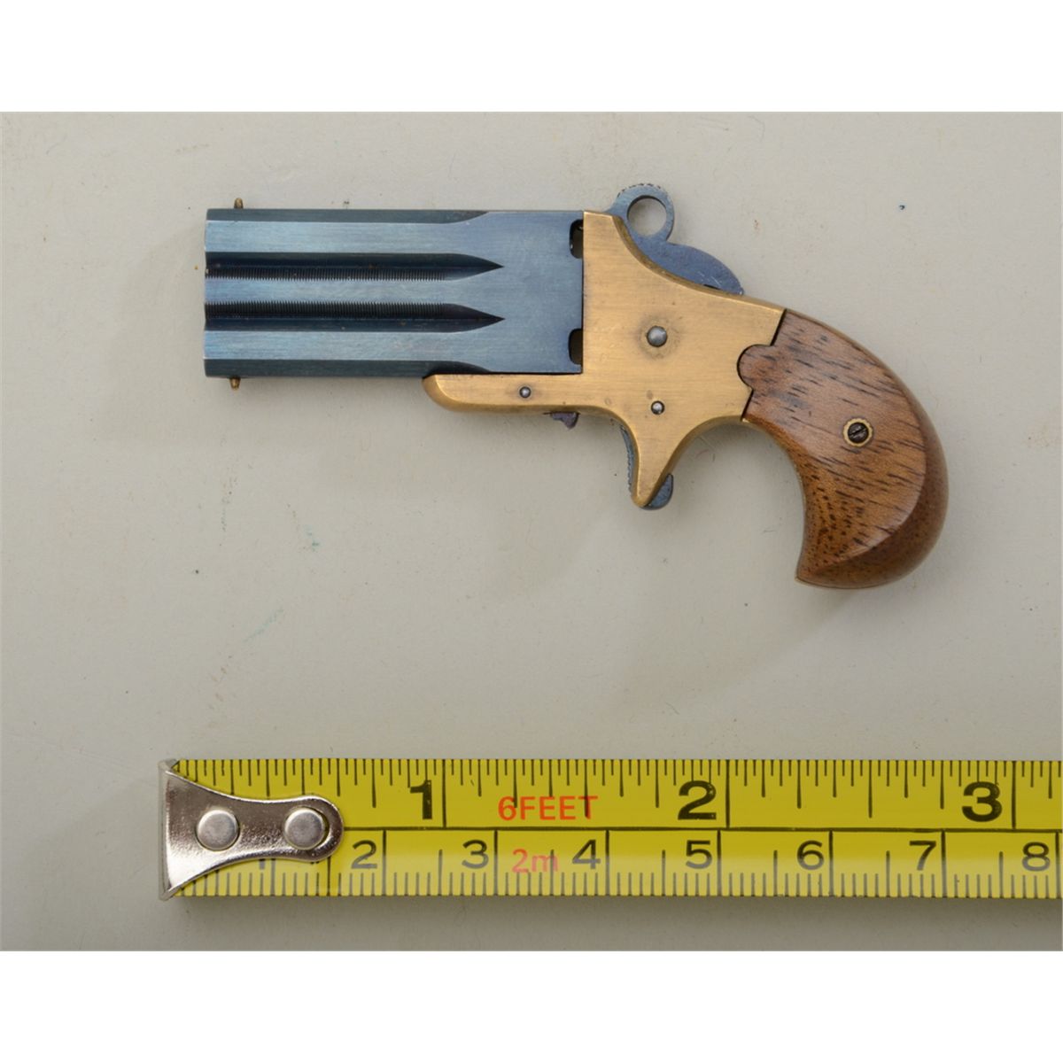 Modern miniature copy of a Marston 3 barrel spur trigger swivel derringer, blue finish to barrel assembly, brass frame, wood grips. This miniature is in overall excellent condition showing little handling; nomarkings, good action. Est.: $500-$750.