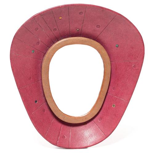 Modern mirror, unusual form in red and tan leather with colorful tooled designs, 8.5"h