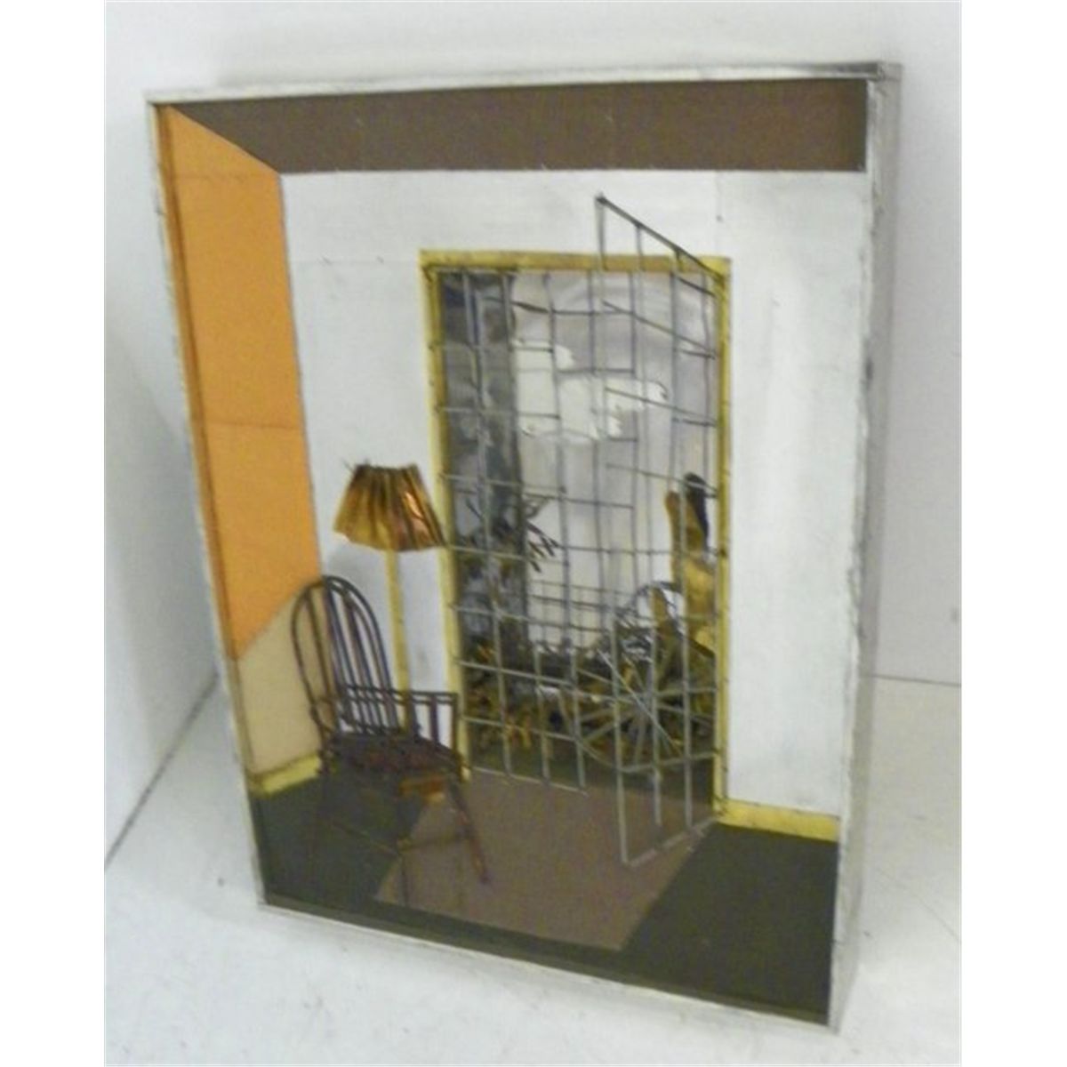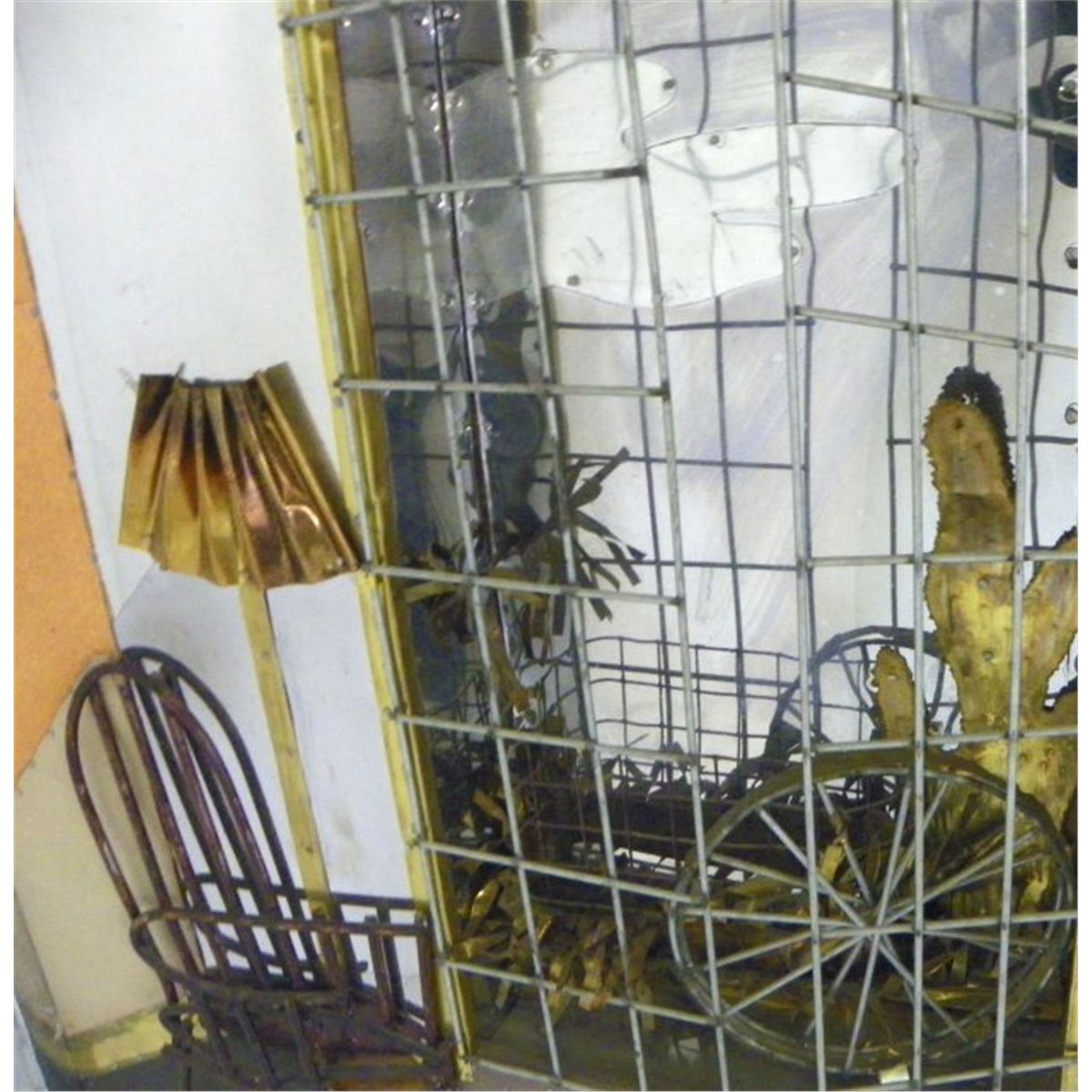 Modern mixed metal, mixed media, collage, wall mount, 34" x 25", monogrammed lower right, circa 1960-70 Please read our terms of sale.