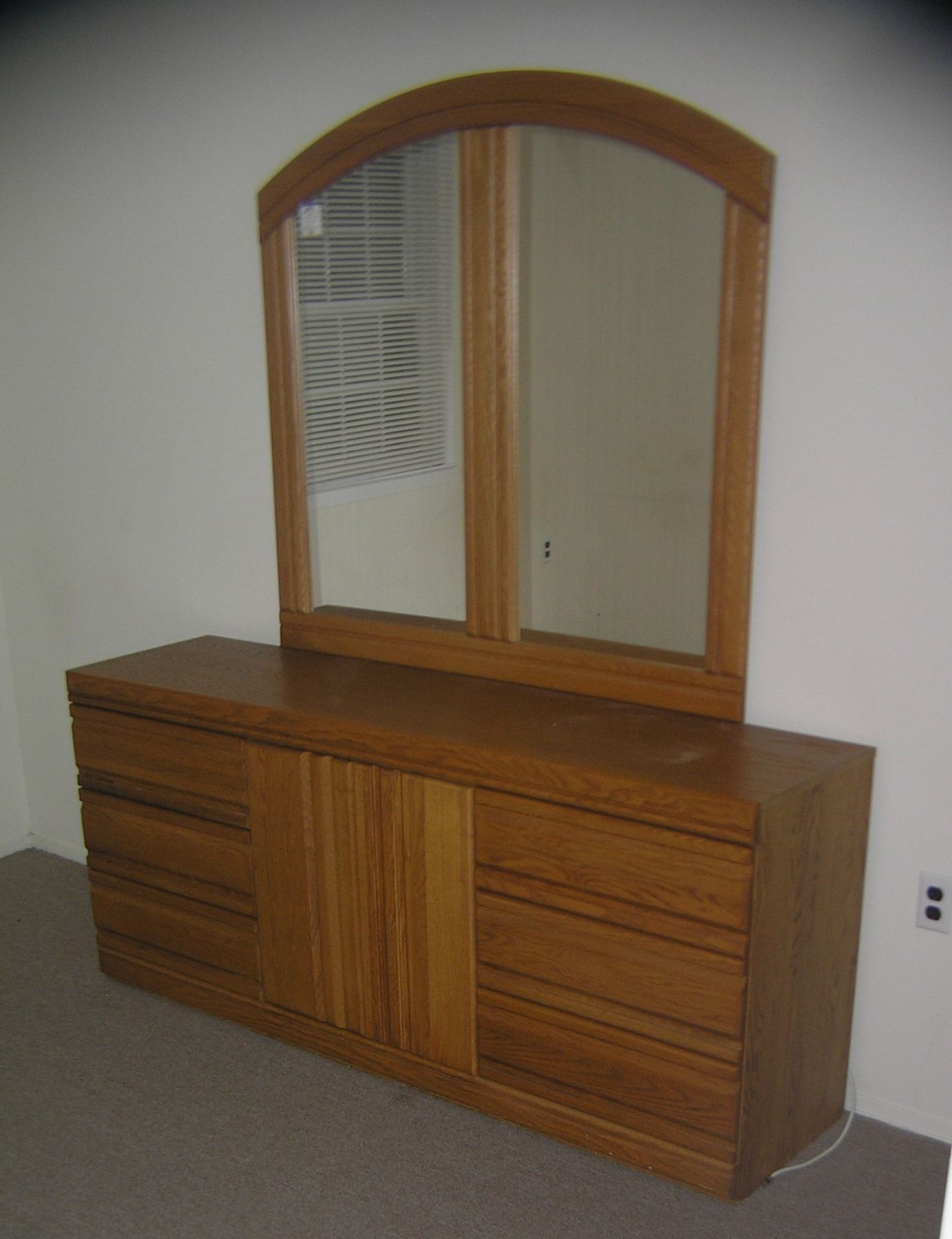 Modern oak 6 drawer dresser and mirror set with storage compartment est. value $500.00-600.00
