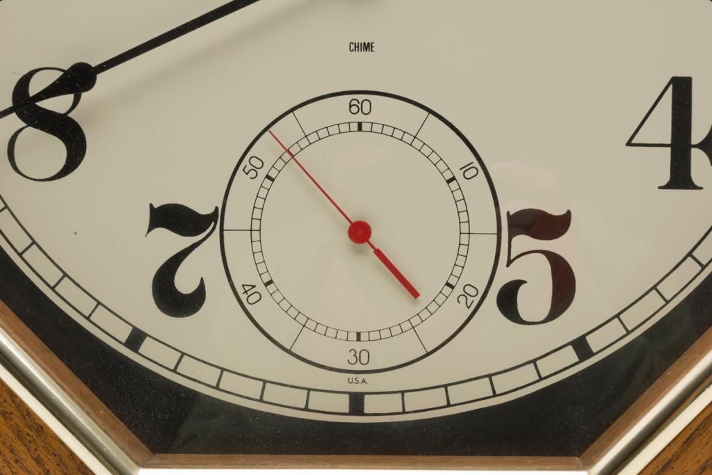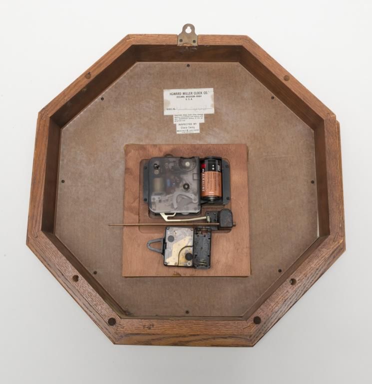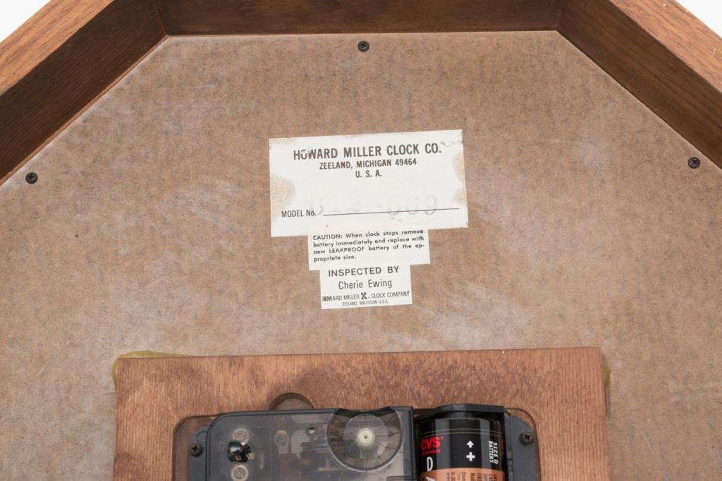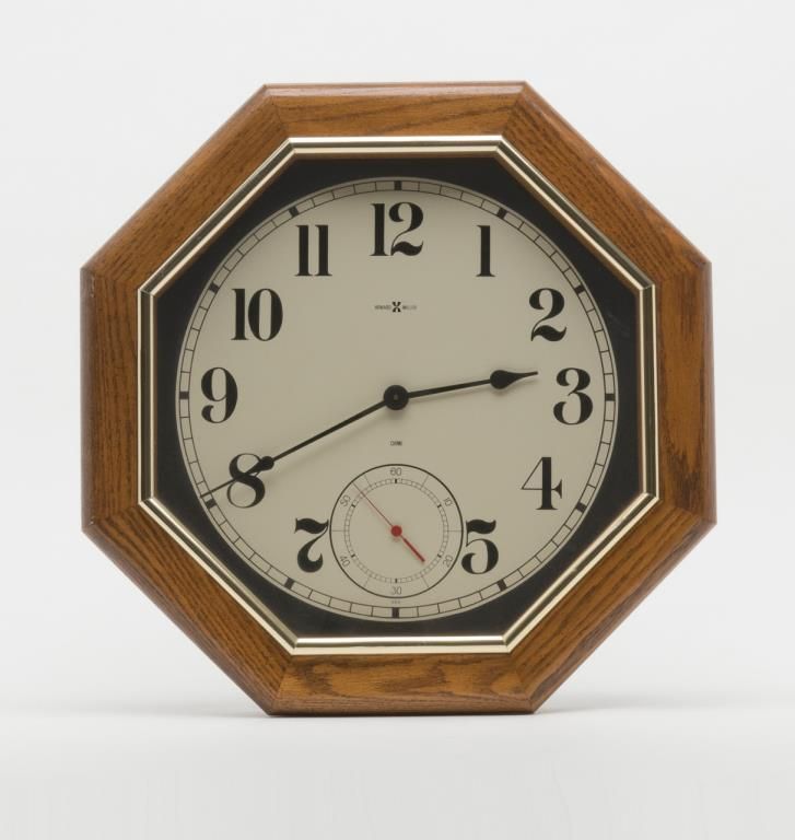 Modern octagon Howard Miller oak wall clock approx. 20” in diameter, battery operated. Est.: $50-$100.