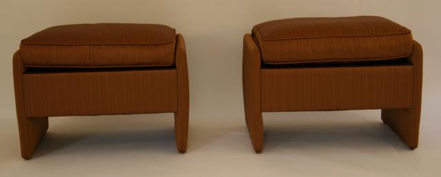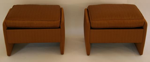 vintage pair of upholstered ottomans h. 17" w. 24" d. 18" new upholstery. Very good condition Material / Technique: silk upholstery in a bronze/gold vague stripe