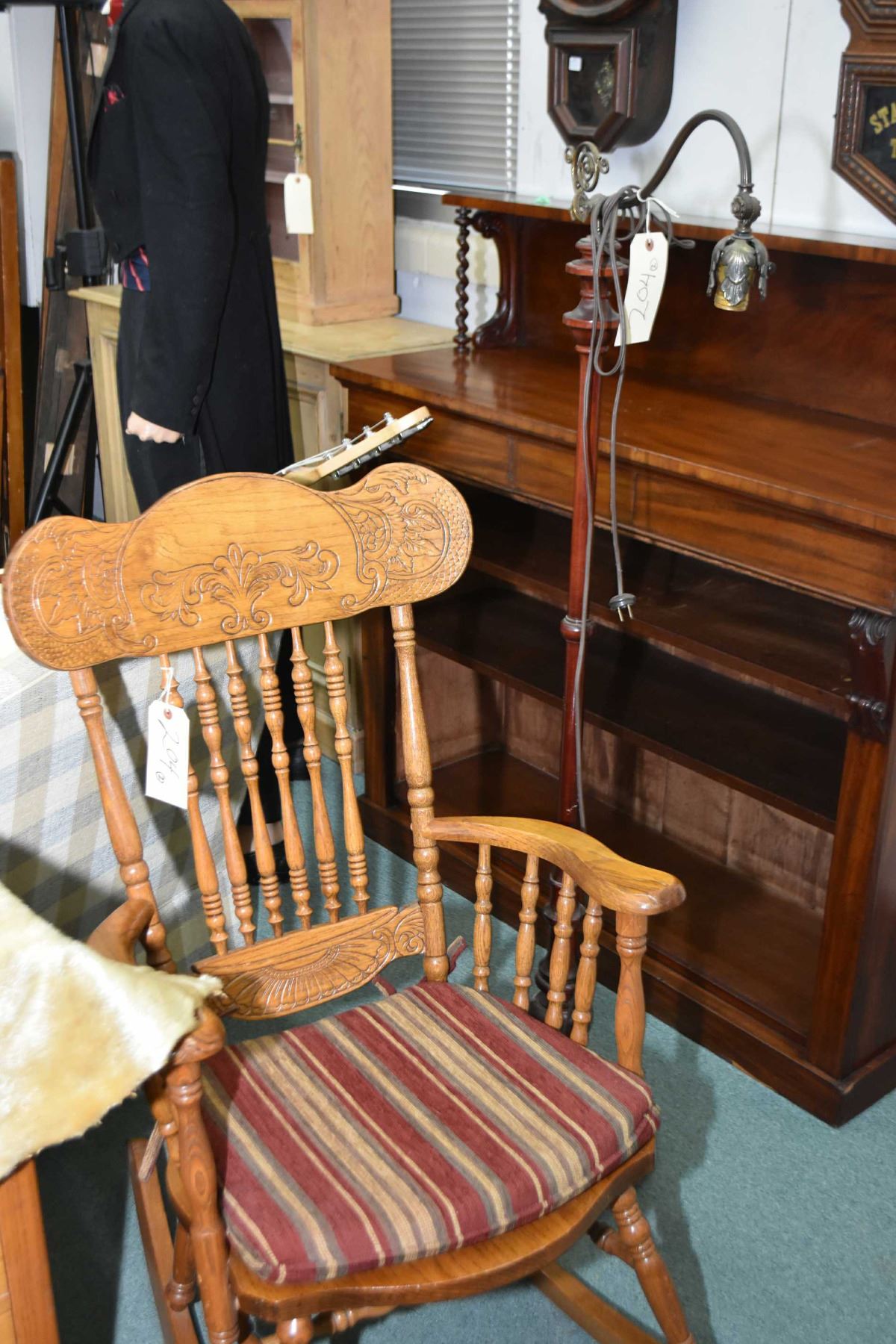 Modern pressed back rocker and a vintage turned wood bridge lamp with cast fixture