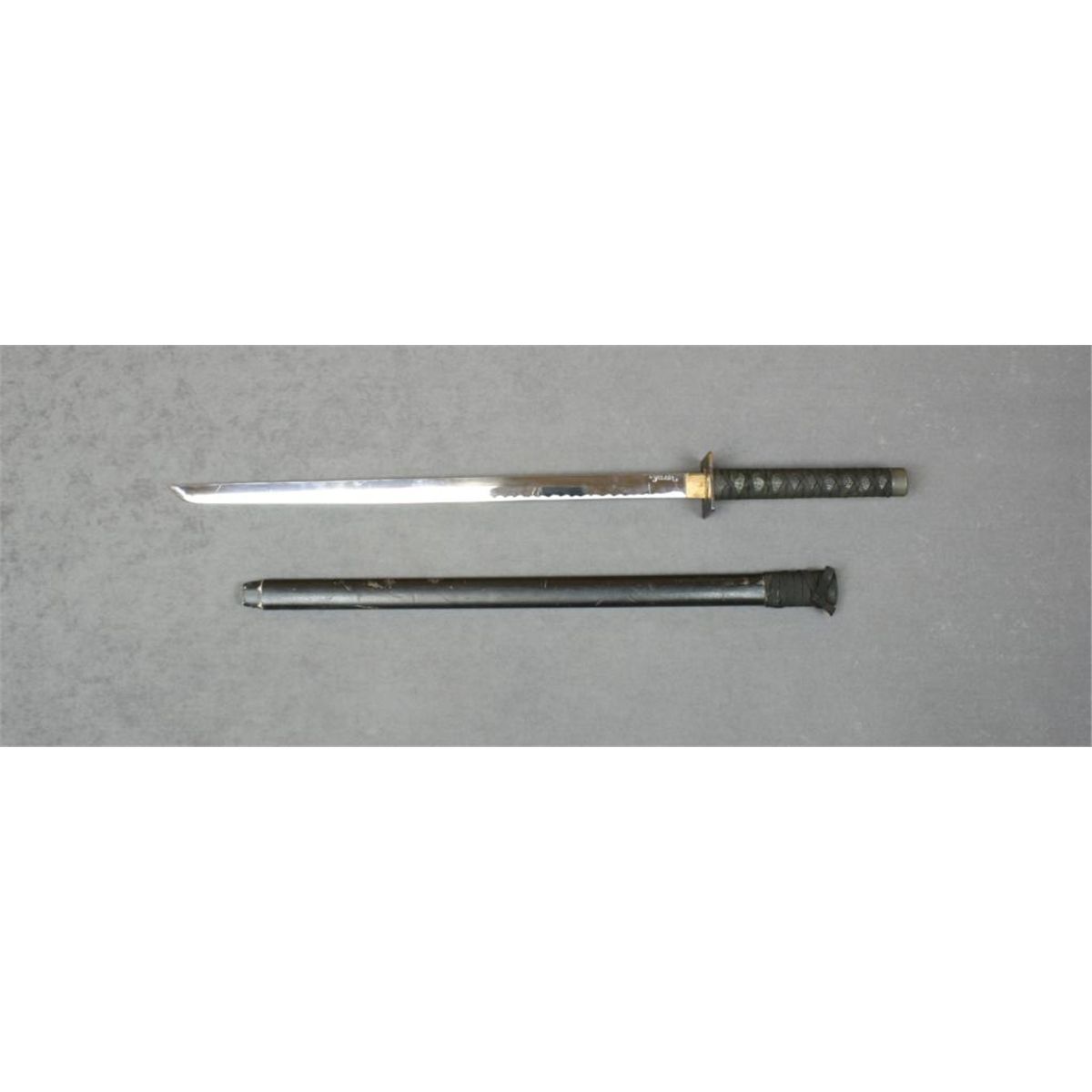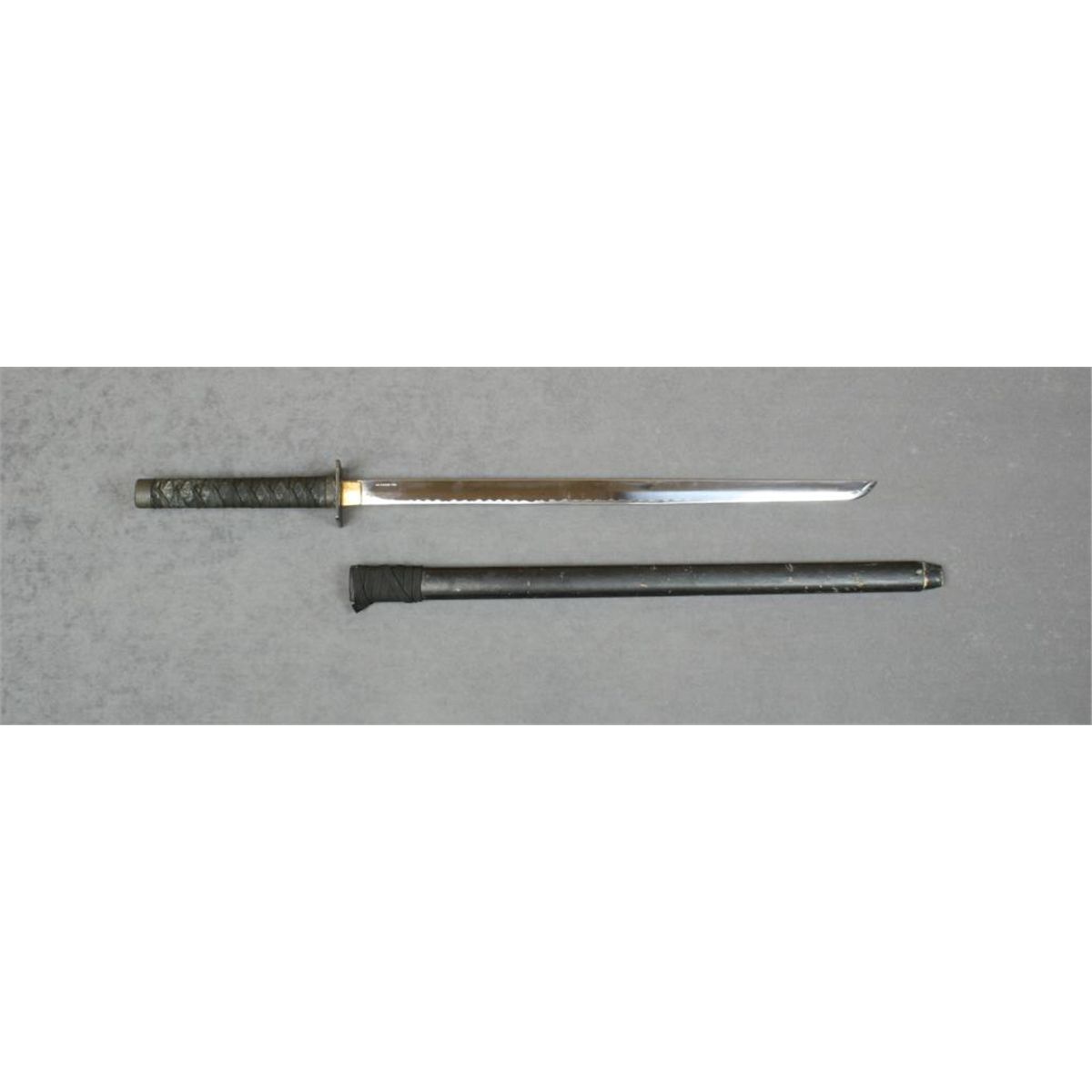 Modern reproduction of a Japanese Samurai sword and wood scabbard with stainless steel marked blade with an inscription “VALOR” at the hilt on one side of the blade; plain square Tsuba, faux Menuki with cord wrap;nice for display. Est.: $75-$150.