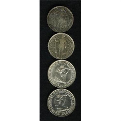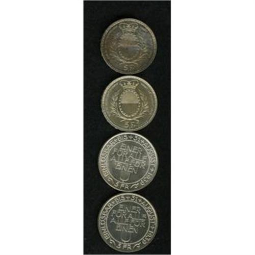 <B>Modern shooting festival silver 5-Franc commemoratives:</B></I> (2) 1934-B, gorgeous UNC specimens, together with 1939-B, one BU and another Prooflike BU. These are all gorgeous. <BR><I>From the Blue Ridge Collection</B></I><BR><BR><b>Shipping:</b> Coin/Currency (<a target="_blank" href="http://www.heritageauctions.com/common/shipping.php">view shipping information</a>)