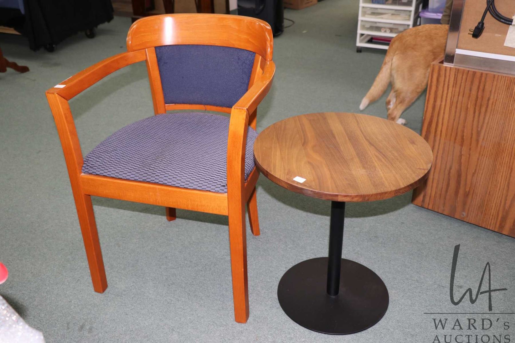 Modern single pedestal round wine table 20" in height X 18" in diameter plus an open arm side chair