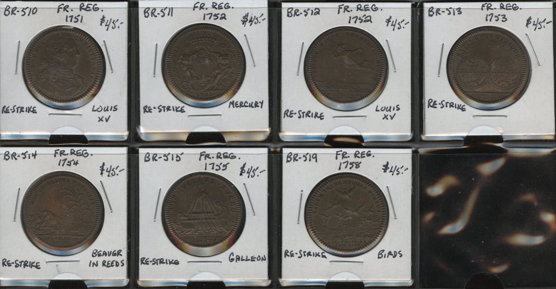 20th-century restrikes / imitations of the Canadian Jetons, in a natural bronze finish that has toned nicely over time. Comprising Br. 510, 511, 512, 513, 514, 515, 519. 7 pcs.