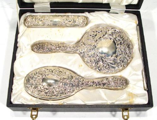 Modern three piece silver backed dressing table set with embossed decoration in a fitted case, Birmi
