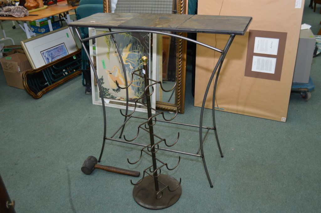 Modern wrought iron and tile top console table and metal wine rack