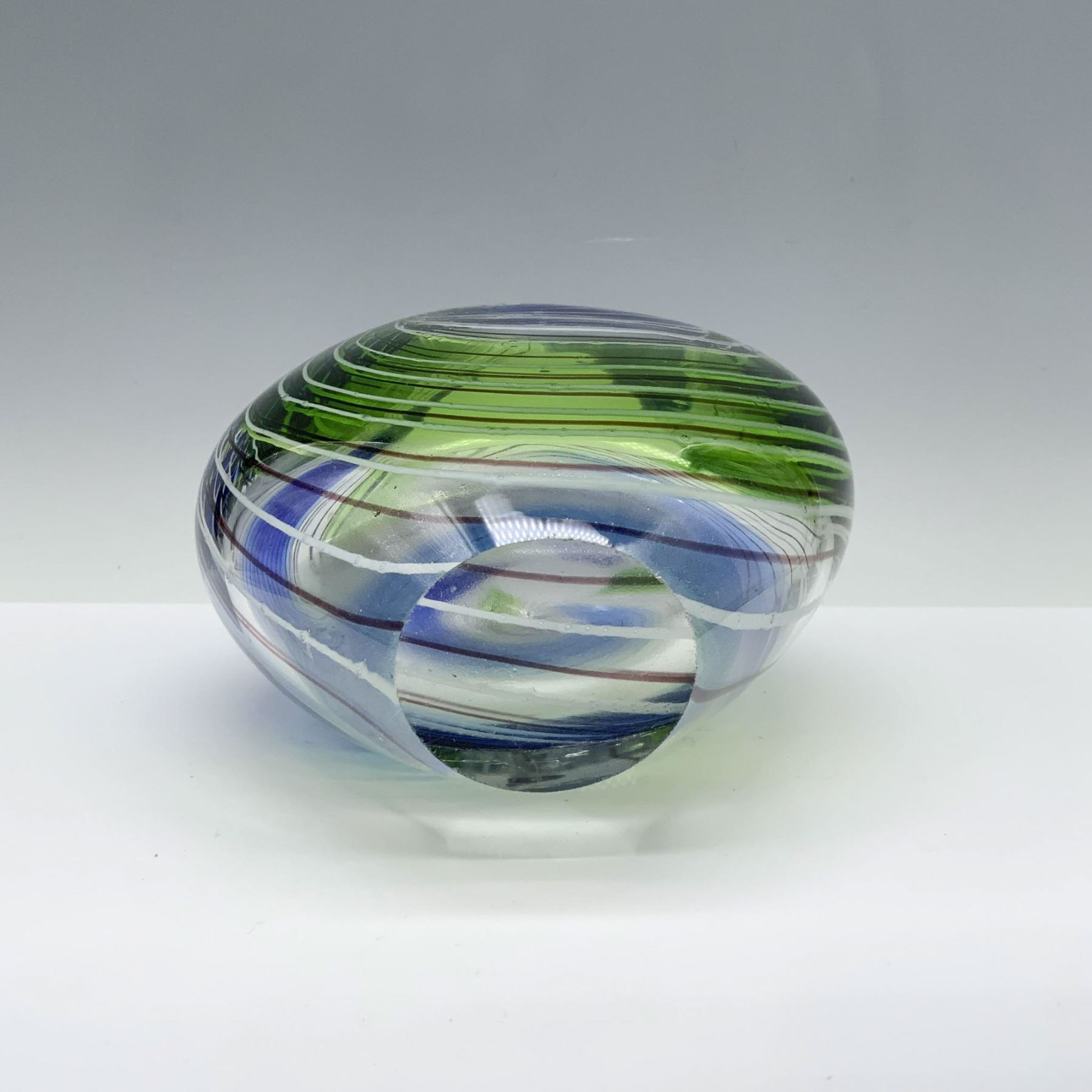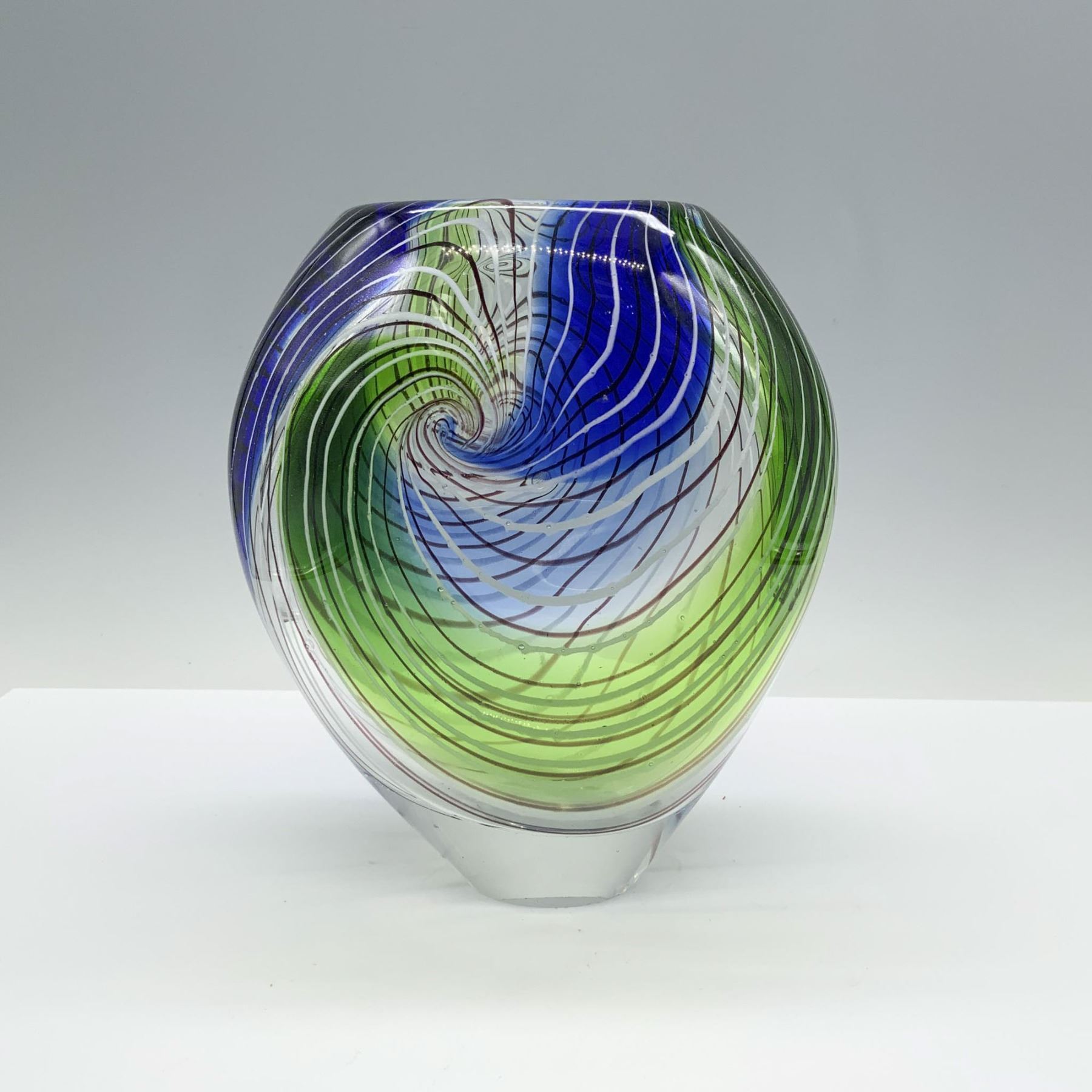 Amazing vase made of clear art glass with blue, green, and white swirls on the body to add a modern touch.