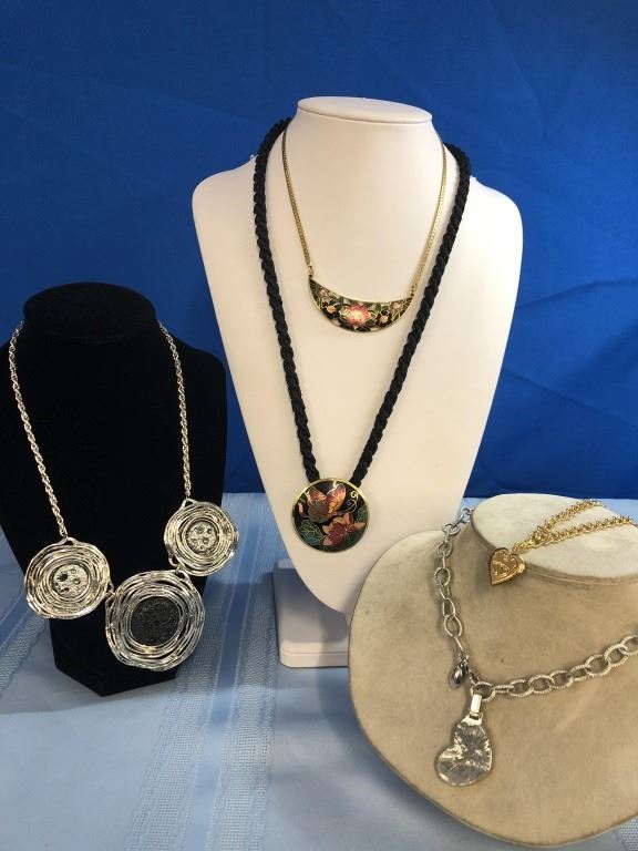This jewellery lot consists of the following: Modernist necklace features three organic circles on a approximately 20 inch drop. 16 inch chain and a heart with clear crystals has a large closure for easy placement. Enamel half moon features florals on a gold tone chain approximately 16 inch. Enamel butterfly pendant (2 in. Round is on a black rope chain approximately 4 inch. Last but not least a pretty gold tone bracelet