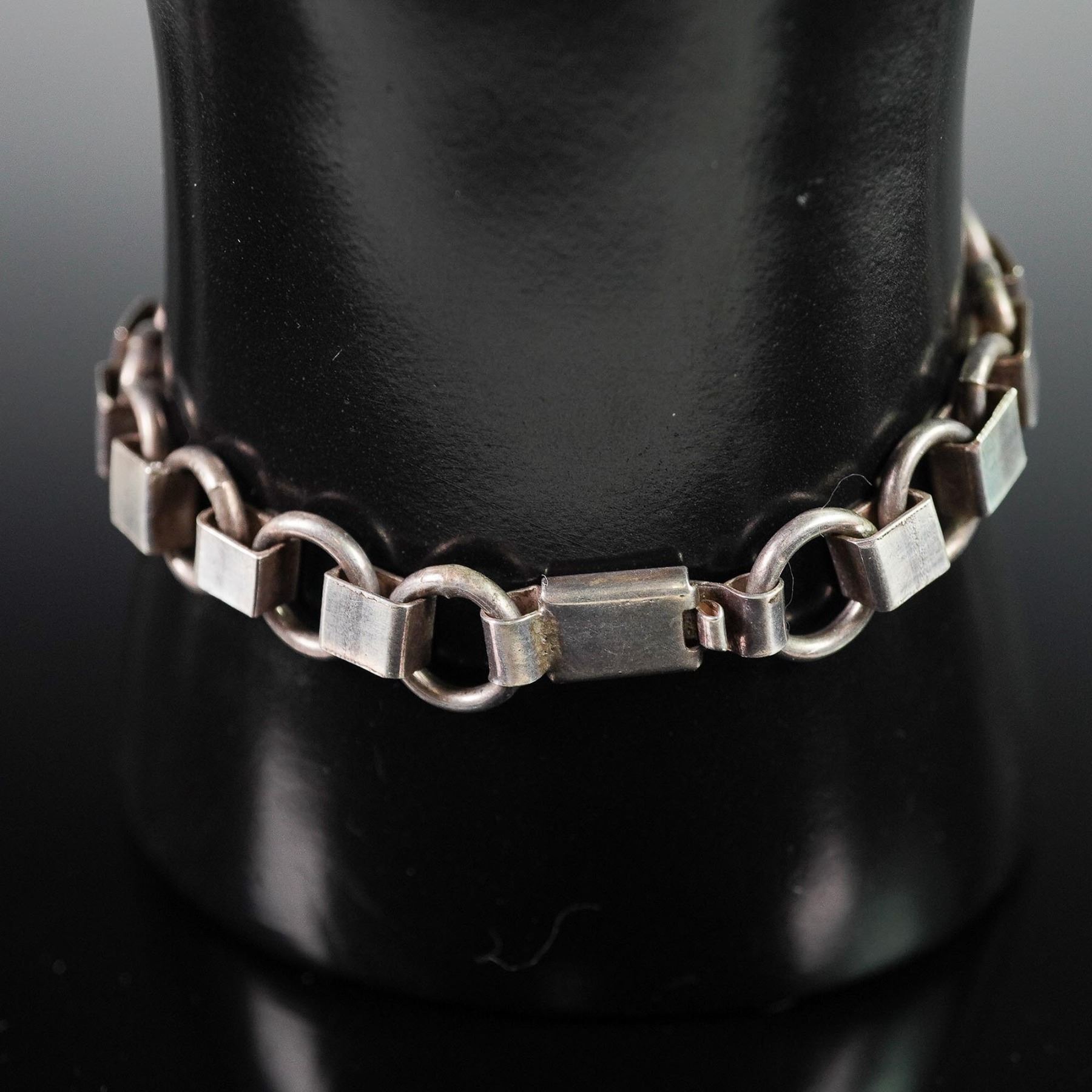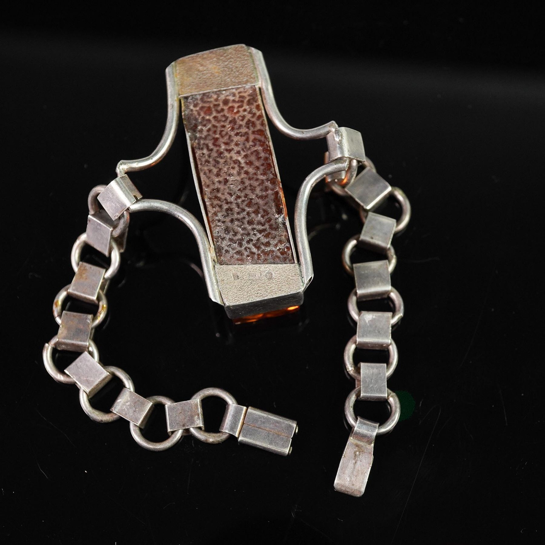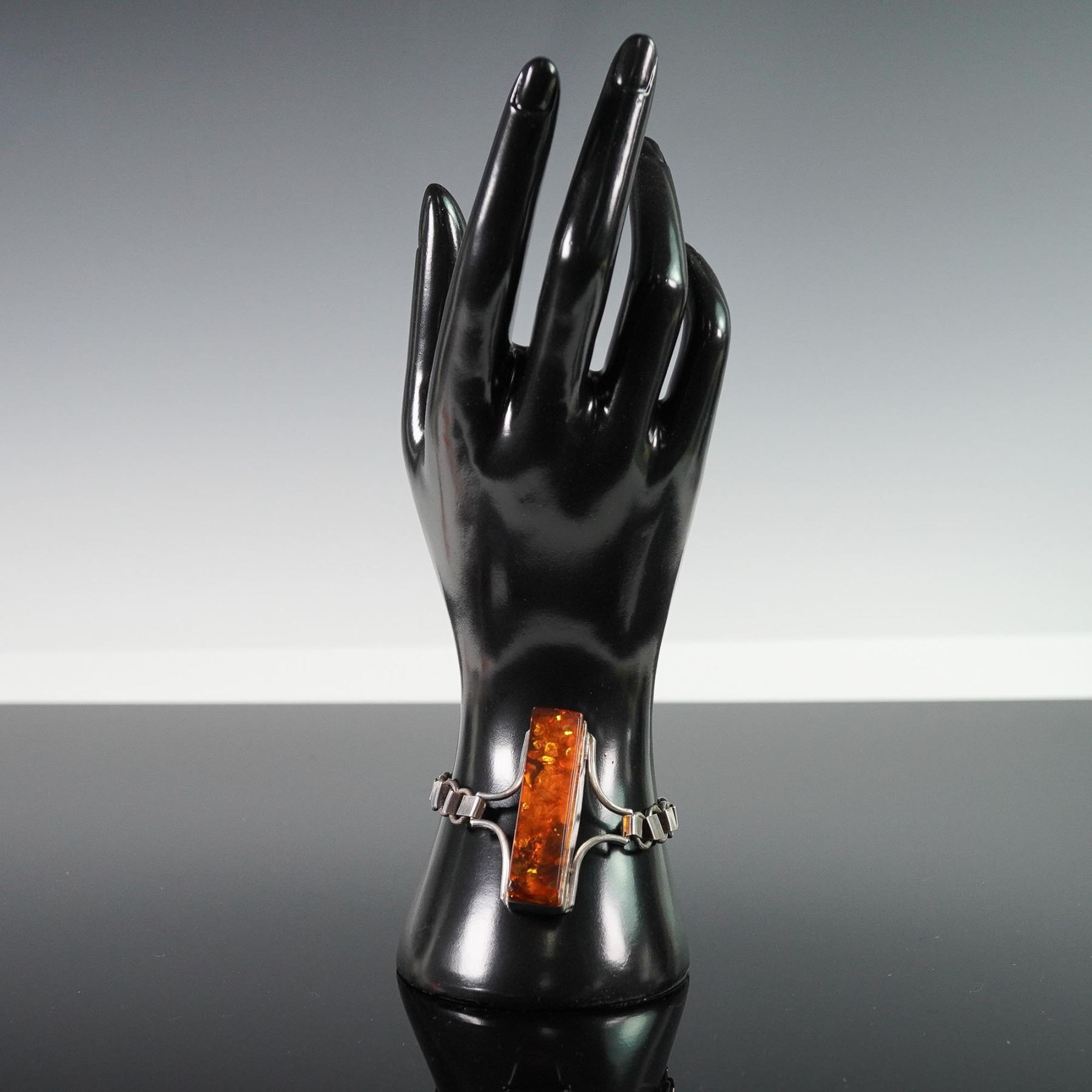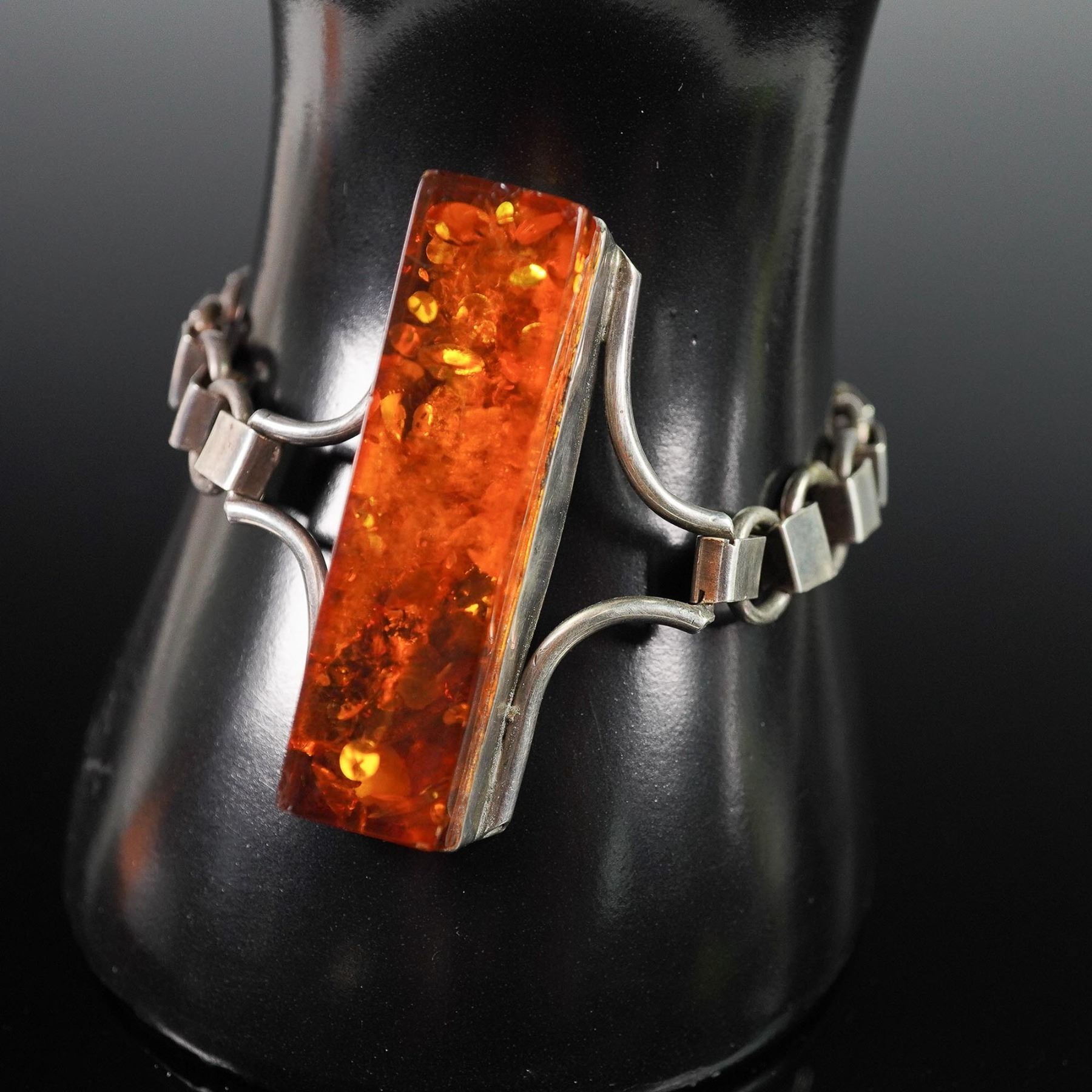 Bold modernist bracelet featuring a prominent rectangular amber with rich honey and gold flecks, set in a sculptural sterling silver frame. The centerpiece is flanked by curved bars and an articulated box-link chain with a secure fold-over clasp. Measures approximately 7.5"L clasp to clasp. A statement accessory with eye-catching presence and retro-inspired design.