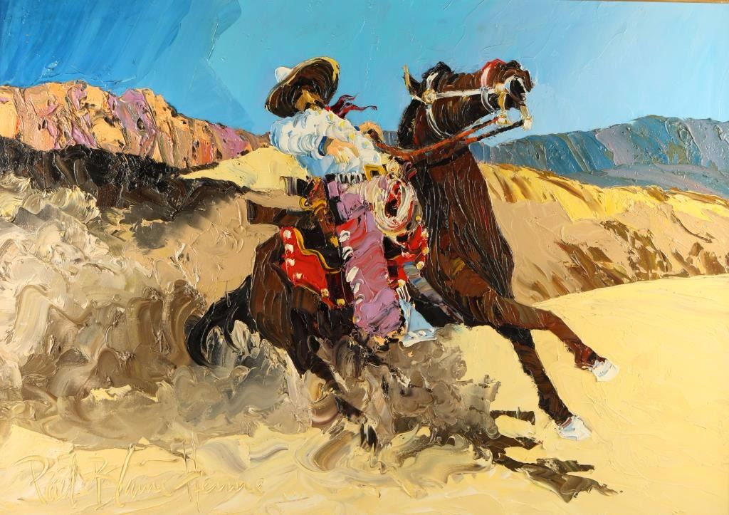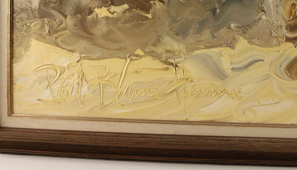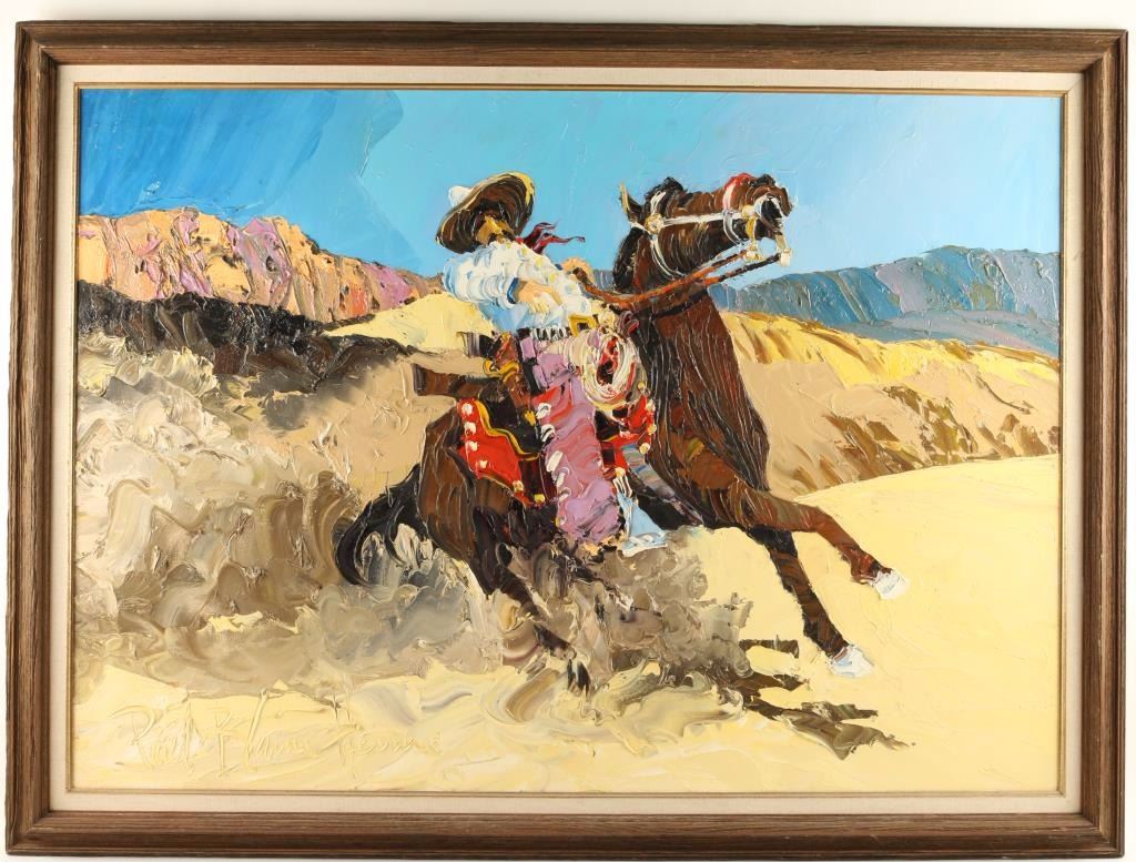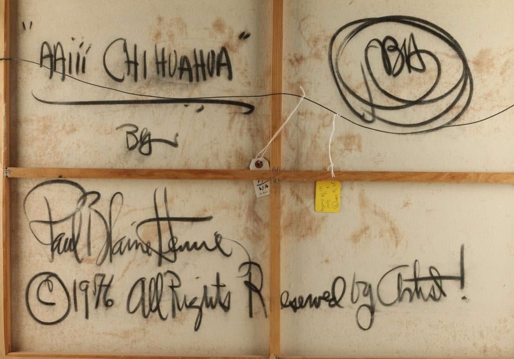Modernist original oil on canvas titled “Aaiii Chi Hua Hua” by Paul Blaine Henrie (Signed). Measures approximately 29 ½” x 41 ½” believed to be one of a series of works he did for a book in 1970’s. This fast risingartist career ended abruptly due to a legal problem. A shame as the man had talent and his portrait of Elvis has been reportedly priced between $500,000 and $1 Million by his heirs. Est.: $750-$1500