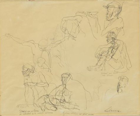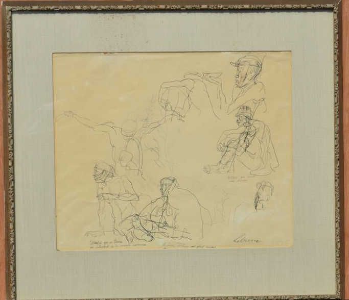 Modernist sketch on paper, approx. 13-1/2” by 16-1/4”, signed lower right Lebrun. Shows title “Turning Turtle” and signed Lebrun 1950. The edges of the paper show some slight deterioration and some acid staining. RicoLebrun (1900 – 1964) was born in Italy, emigrated to the United States in 1922 where he taught at the Art Student’s League until 1938 when he settled in California and taught at the Chouinard Art Institute in LosAngeles. In 1952 and 53 he visited Mexico and was influenced by the Mexican Masters, 1958 he worked with Joseph Albers at Yale University. Consigned from a local estate. Est: $300- $600