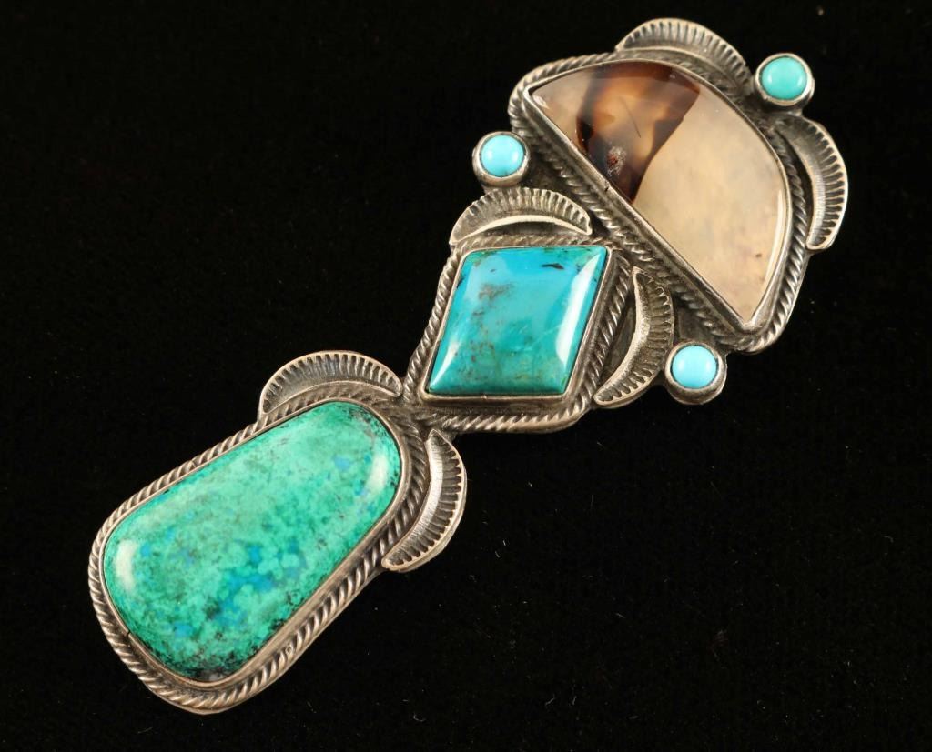 maker marked H. Ration turquoise and agate set in sterling.2.5"x1 15.35g