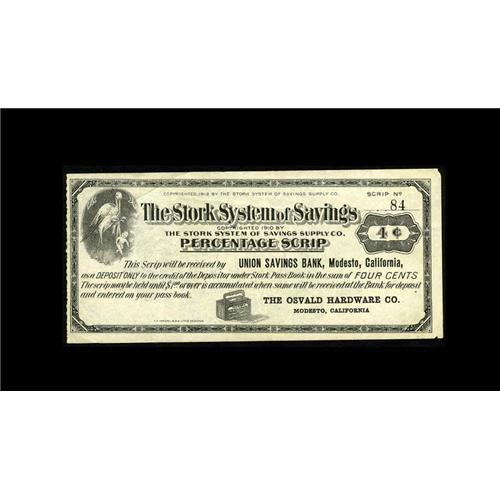 <B>Modesto, CA- The Osvald Hardware Co. 4¢ Undated</B></I> Just a plain rare denomination for the Stork System of Savings. <B>Extremely Fine.</B></I>