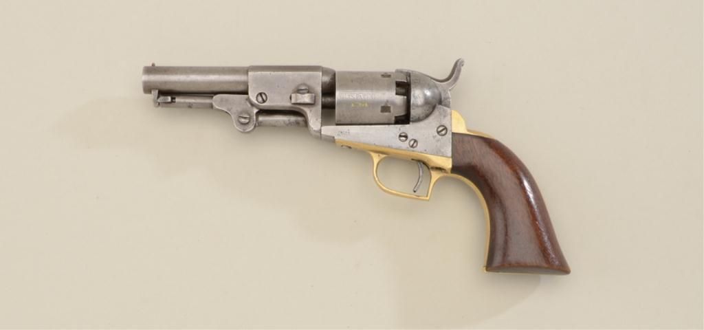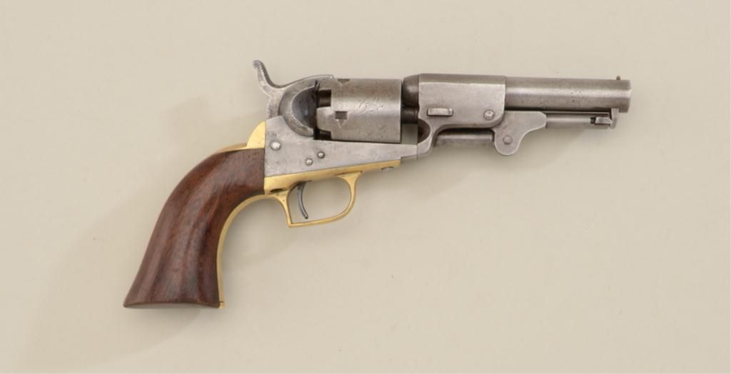 Modified Colt Model 1849 Pocket percussion revolver, .31 cal., 4” ½ round/half octagon barrel, blue finish, wood grips, #245. This gun is in overall good condition as expertly modified showing re-numbered frame, barrelassembly, trigger guard and backstrap; cylinder shows considerable original cylinder scene and is numbered 100691 with rammer and cylinder arbor numbered 8946 and un-numbered wedge; action needs work as cylinder bolt is locked; overall grey patina; very good grips. Est.: $400-$800.