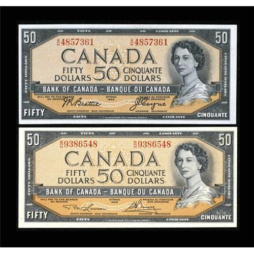 <B>Modified Portrait 1954 $50s</B></I><BR> These notes grade <B>Crisp Uncirculated </B></I>or better - $50 BC-42a; 42c.<BR><I>From The Thomas M. Flynn Collection</B></I><BR><BR><b>Shipping:</b> Coins & Currency (<a target="_blank" href="http://www.heritageauctions.com/common/shipping.php">view shipping information</a>)