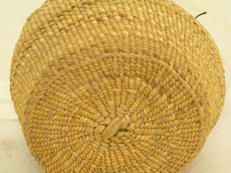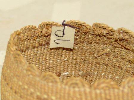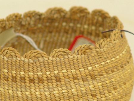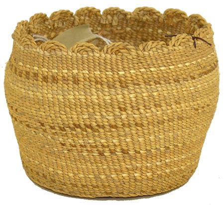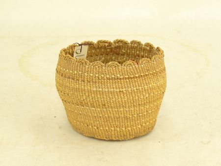 Early 1900s, Very fine weave trinket basket with faint polychrome designs and fancy scalloped twist rim. very good condition. Ex. Judge Bonner Collection. 3" x 3-1/2"