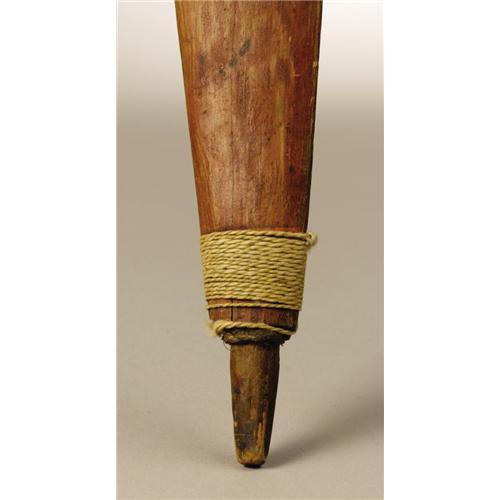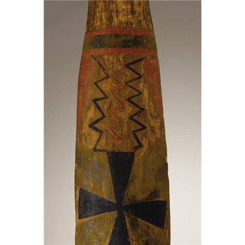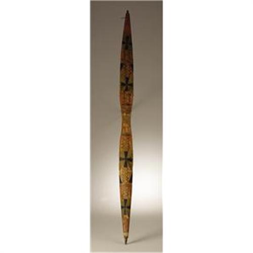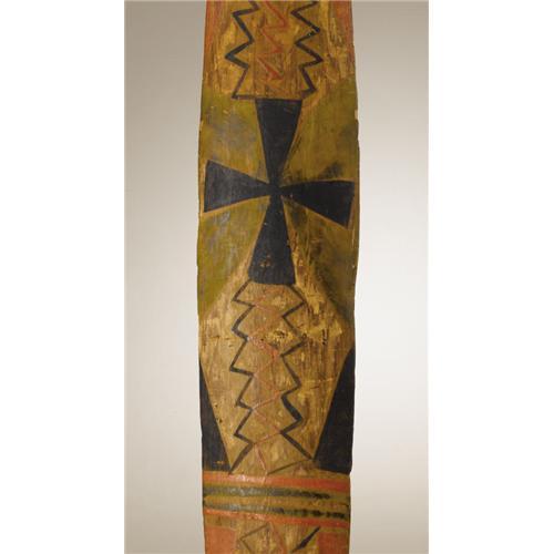 <B>Modoc Wood Bow painted with Maltese crosses</B></I><BR>Circa 1880<BR>Length 53 1/2 in.<BR><BR>This classic example is carved of yew wood and finely painted with a pattern of Maltese crosses in black against a green background and lightning bands in black and red over the natural wood background. The bow is complete with a sinew bowstring.<BR><BR>